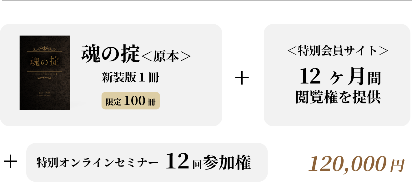 >>“魂の掟:原本”新装版1冊 + 特別会員サイト12ヶ月間の閲覧権を提供 + 特別オンラインセミナー12回参加権を支援する