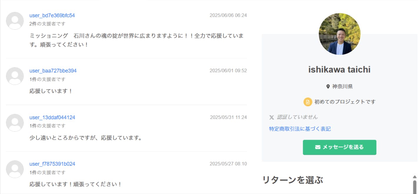 本日は、心強い支援者の皆さまから届いた応援メッセージをいくつかご紹介させていただきます。どの言葉も、私たちの背中を強く押してくれるものでした。