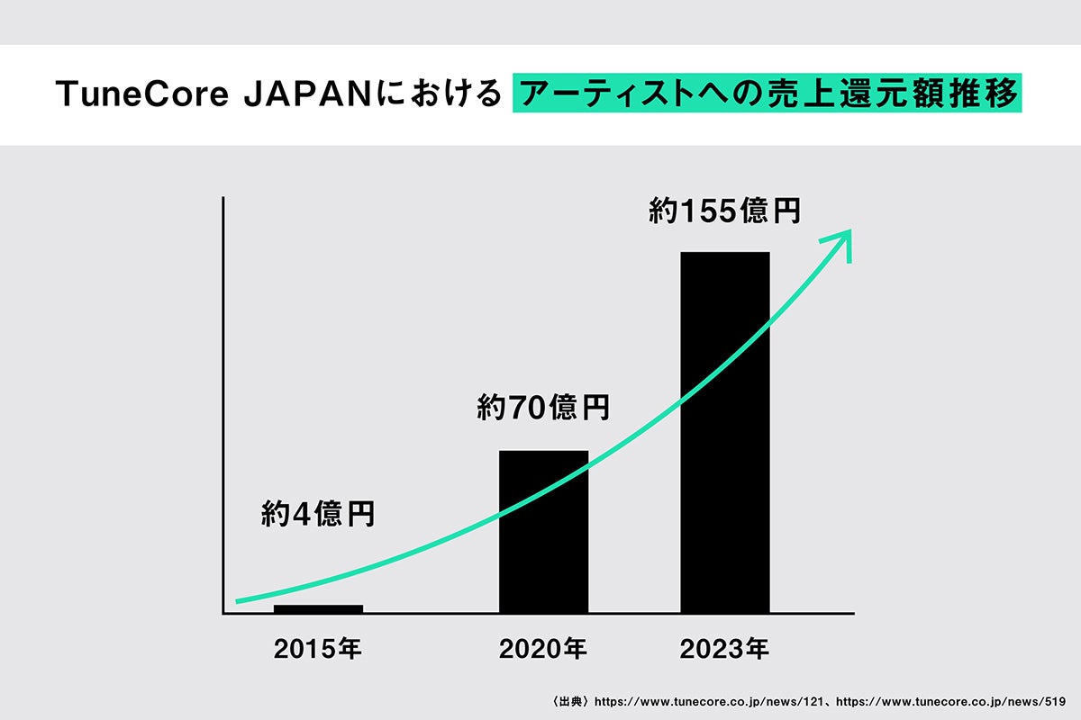実際に、インディペンデントの音楽シーンを見ると、その市場規模は右肩上がりに拡大しています。例えば、音楽ディストリビューションサービス「TuneCore JAPAN」は多くのインディペンデント・アーティストが楽曲配信の際に活用しているサービスですが、本サービスのアーティストに対する売上還元額は、2015年の約4億円から2023年には約155億円にまで成長してきました。