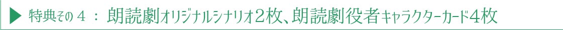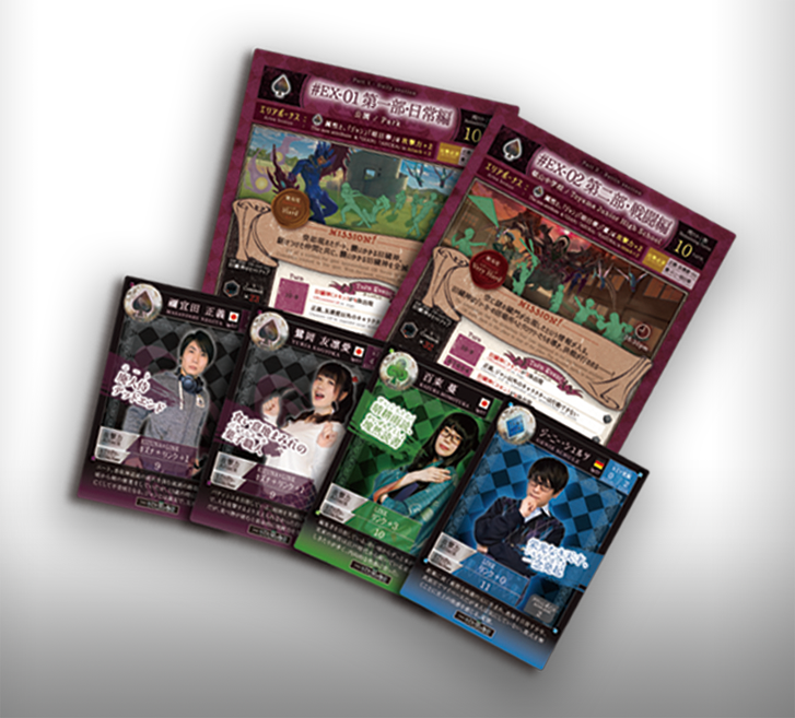 朗読劇版のシナリオを再現したシナリオカード2枚、役者さんの写真版キャラクターカード4枚をセットでお届けします!