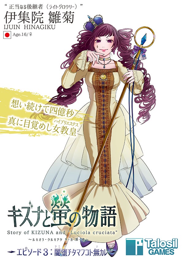 2018/10/13 12:23キズナと螢の物語プロジェクトの広報担当です。今回もエピソード3に登場するボスキャラクター「真ジョーカー級」のアートを紹介させて頂きます! 御霊傑尼(ゴリョウジーニー)ジーニー・シュルツは、同じ17歳であり共に若いグロウリーをフォローしている明日華に、淡い想いを抱いていた。だが、才能溢れる正義が突如現れてからは、その彼に惹かれる明日華に複雑な感情を頂き始め、彼は鬱念とした思いに囚われていた。そんな時、明日華が任務中に死亡する。当惑する彼の前に現れた伊集院 照皇は、彼の耳元で囁いた。「……力が欲しいのか?」――ジーニーの意識は、そこで途切れた。 御霊正義(ゴリョウマサヨシ)13歳の時に母親を亡くし、任務中に父親も亡くした禰宜田 正義。そんな彼の前に、真ジョーカー級となった父親が現れる。なんとか退けるものの、強さを求め自立を求めた故の結果とはいえ、鬱積とした思いが残っていた。彼の前に現れた伊集院 照皇は、実の父を殺して生きる正義に「親殺し」と囁きかけ、正義はその重責に耐えられず自宅に引き籠る。やがて全てが分からなくなった頃。聞き覚えのある幼馴染や親友の声に、正義は……斬りかかった。 常闇ノ瓊矛(トコヤミノヌボコ)13年前の犯人である科学者、伊集院家の後継者である照皇を闇へと引き込みその精神を堕落させることで、伊集院家への復讐を目論んでいた。だがその計画はグロウリーたちによって打破されてしまう。討伐されたヌボコノナカヌシだったが、その後、異世界でさらなる力を蓄え好機を狙っていたのだった。そして彼は真の姿を開放し、グロウリーたちに立ちはだかる。 いかがでしたでしょうか。前回から引き続き紹介させて頂いた6体のキャラクターは、どれも恐ろしく強大な敵となっています。 それでは残り期間17日間、引き続きよろしくお願い致します。 もっと見る