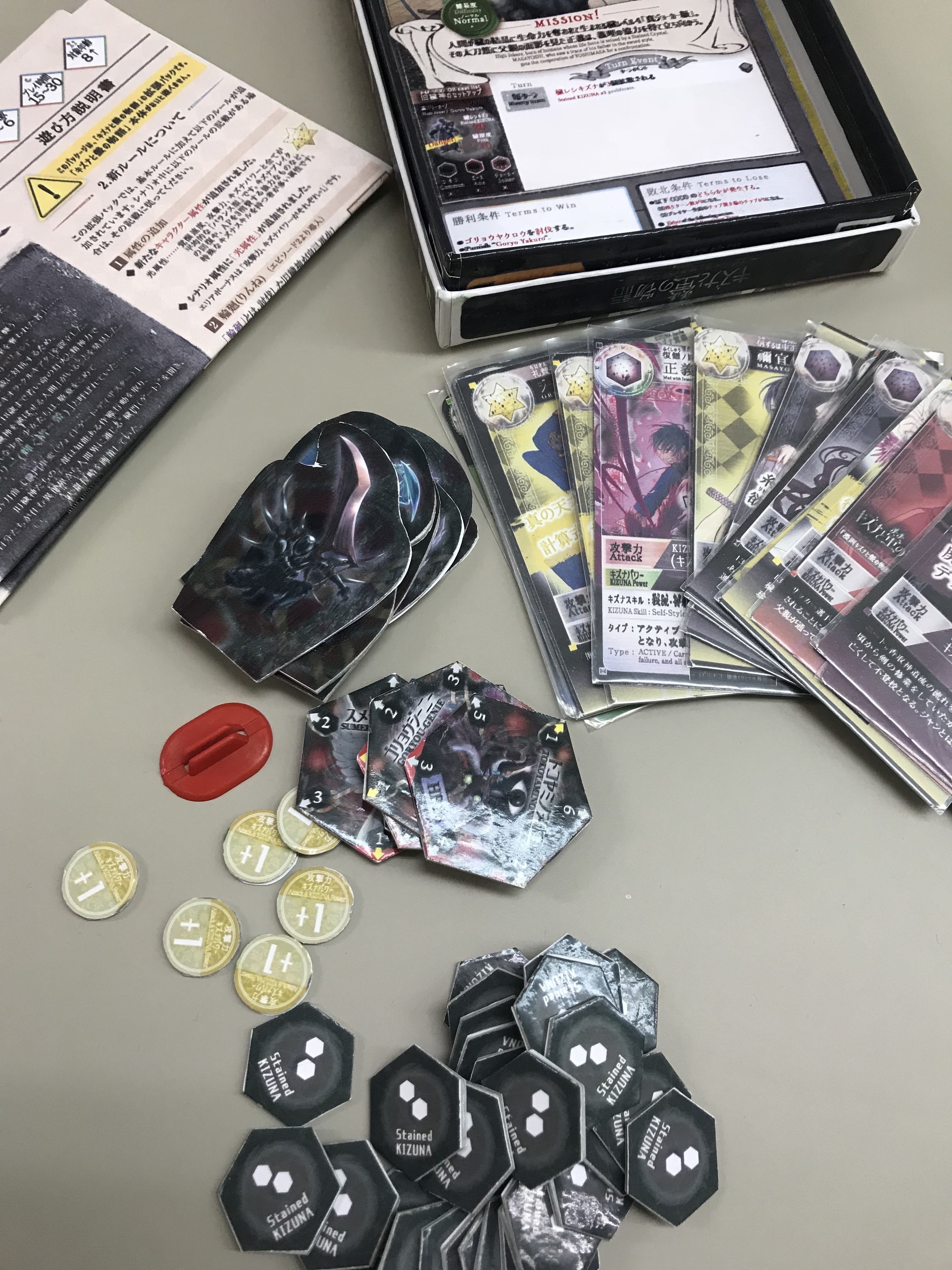 キズナと螢の物語プロジェクトの広報担当です。 「エピソード3:闇堕チタマフコト無カレ」のサンプルパッケージが届きました。まだまだ開発中の写真ではありますが、内容物一式が出揃いました!完成までまだ時間を頂きますが、今しばらくお待ち頂けますと幸いです。 また、いくつか頂いたご質問に回答させて頂きます。 Q:エピソード3を遊ぶには、何が必要ですか?A:「キズナと螢の物語」本体のみが必要です。「エピソード2:穢サレシ少年」がなくても遊べますが、エピソード2から追加された新ルールを理解するために慣れておくとより遊びやすいと思います。 Q:リターンの到着はいつ頃になりそうですか?A:11月24日より開催のゲームマーケット2018秋の直後にお届けしたく思っております。ただ、印刷所からの輸送やリターンの内容によって遅れる可能性がございますので、予めご了承をお願い致します。 それでは残り22日間、スタッフ一同全力で走りきりますので、何卒よろしくお願い致します。