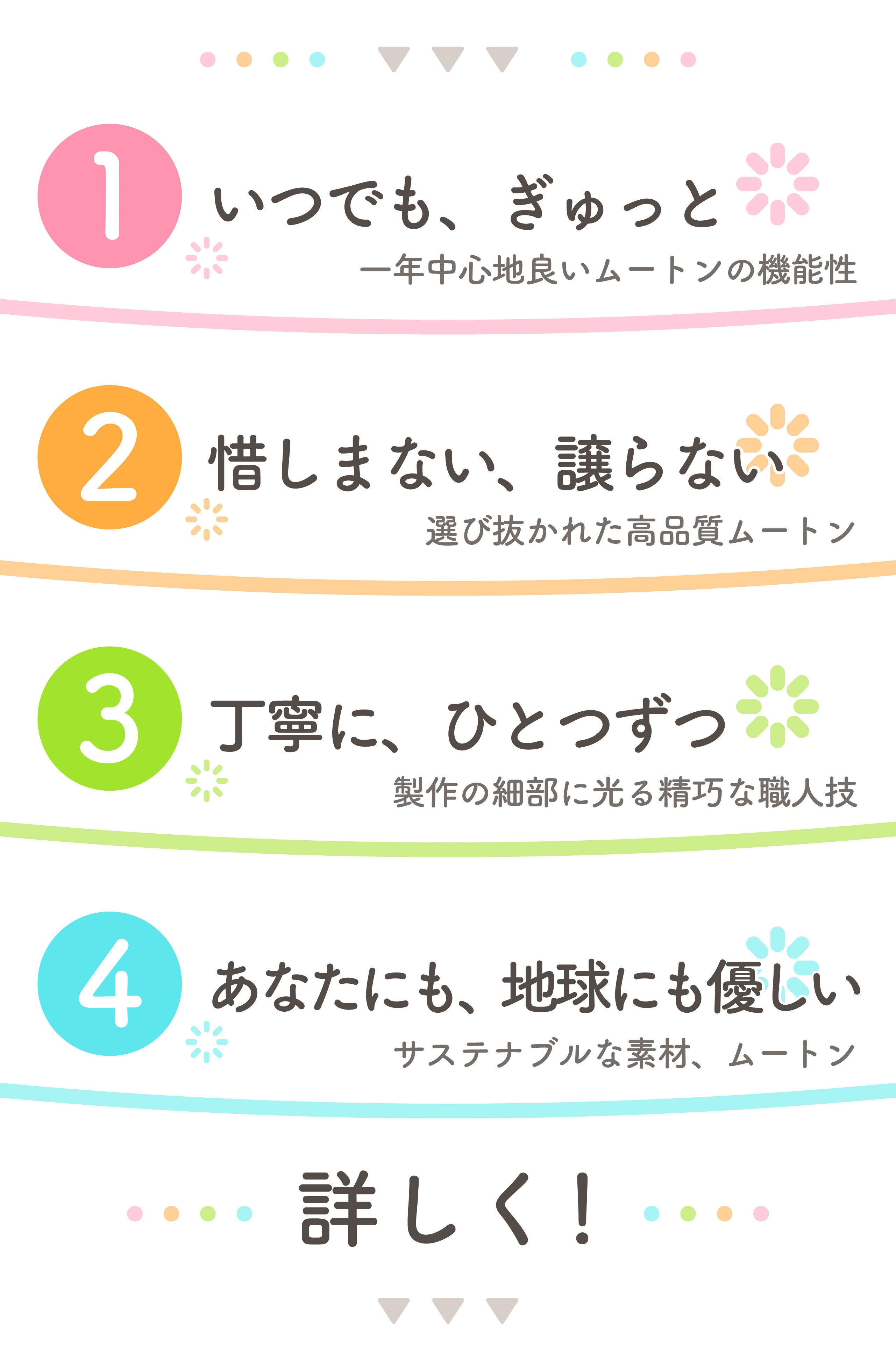 化学繊維と違い、ムートンは体温の変化に反応する素材なので、寒い日には温かく、暑い日には涼しく、快適な温度を保ってくれます。