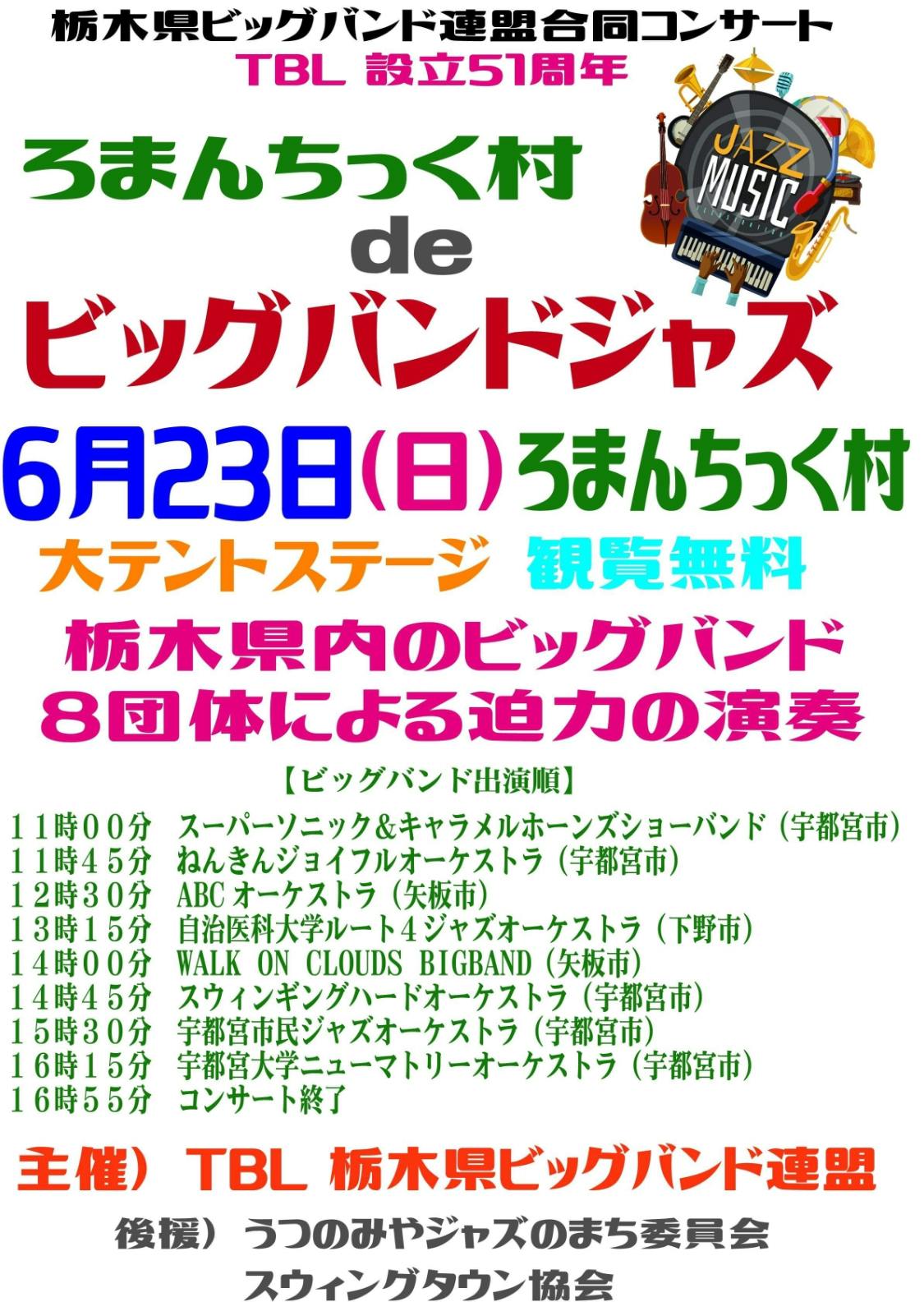 6/23(日)TBL(栃木ビッグバンド連盟)の合同コンサートがろまんちっく村で開催されました。
