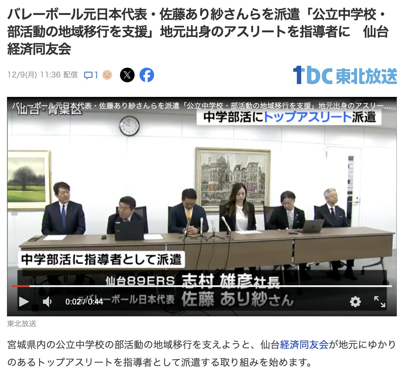 仙台経済同友会のプロジェクトチーム<今回シンボルアスリートとして参画する左から3番目元バレーボール日本代表 佐藤あり紗さん、仙台89ERSで活躍した志村雄彦さん>今回は、部活動を支える新しい支援モデルを全国に広げる「部活動支援プロジェクト」を立ち上げました。
