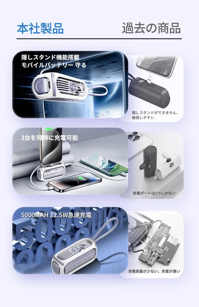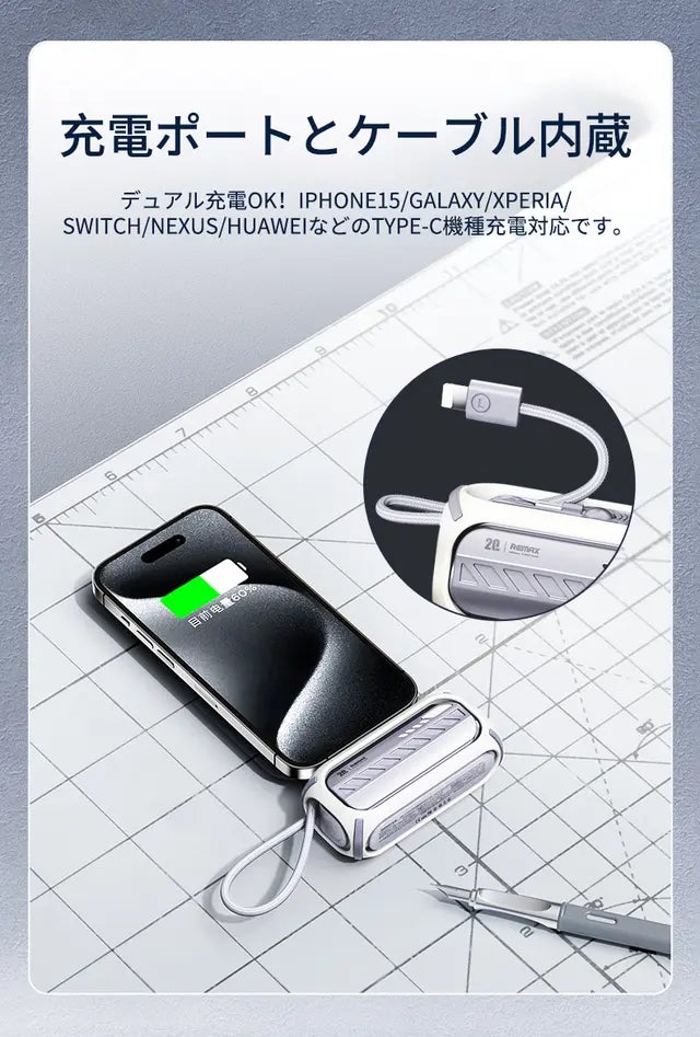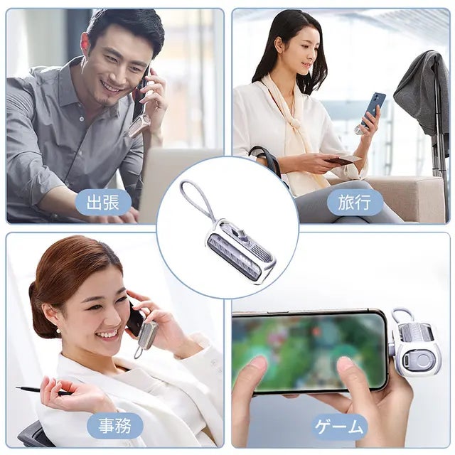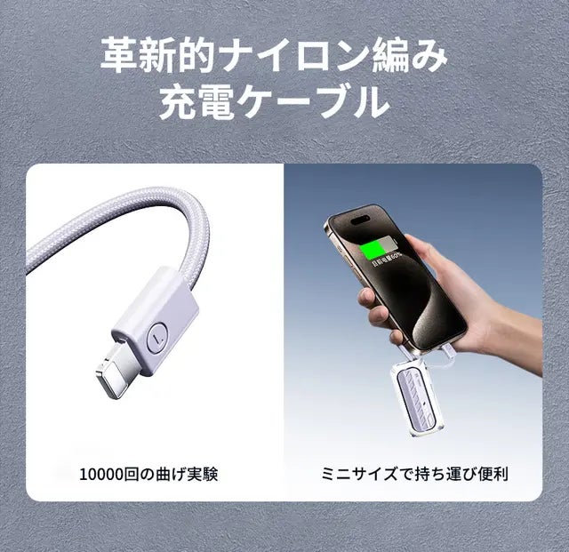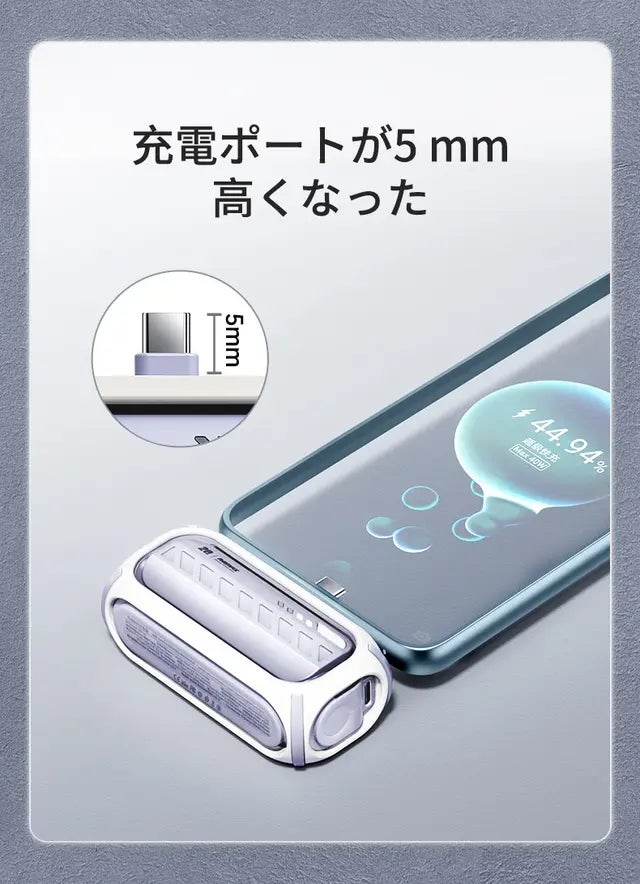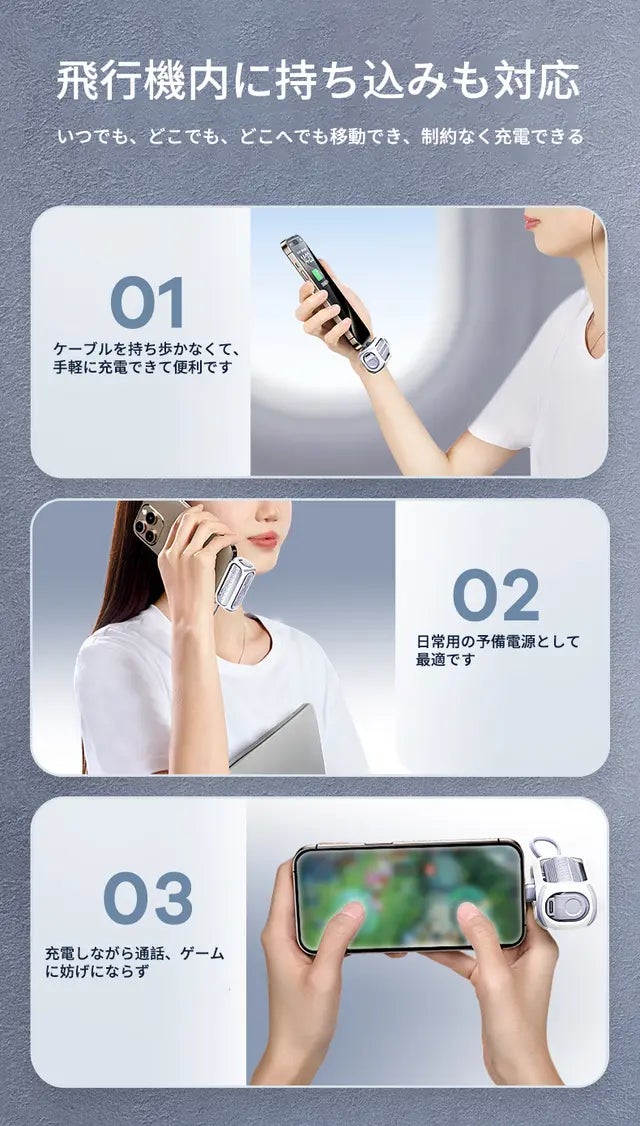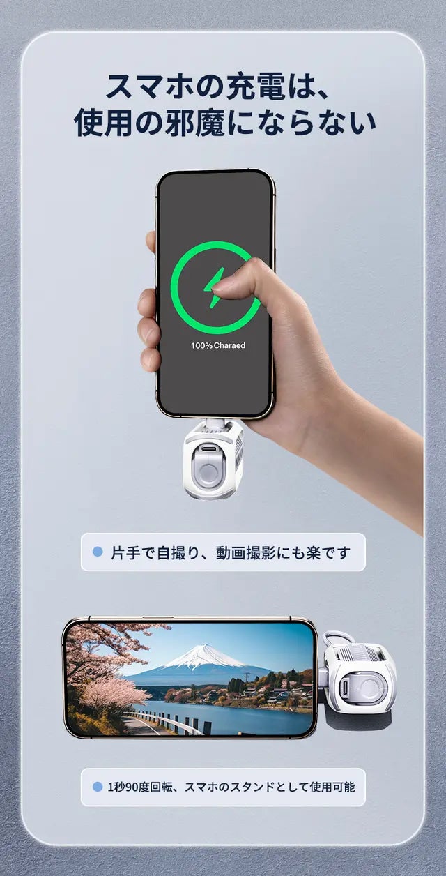 コンパクトで持ち運びしやすいデザイン、様々な充電シーンに対応し、使いながら充電できるので、充電切れの不安がなくなります。