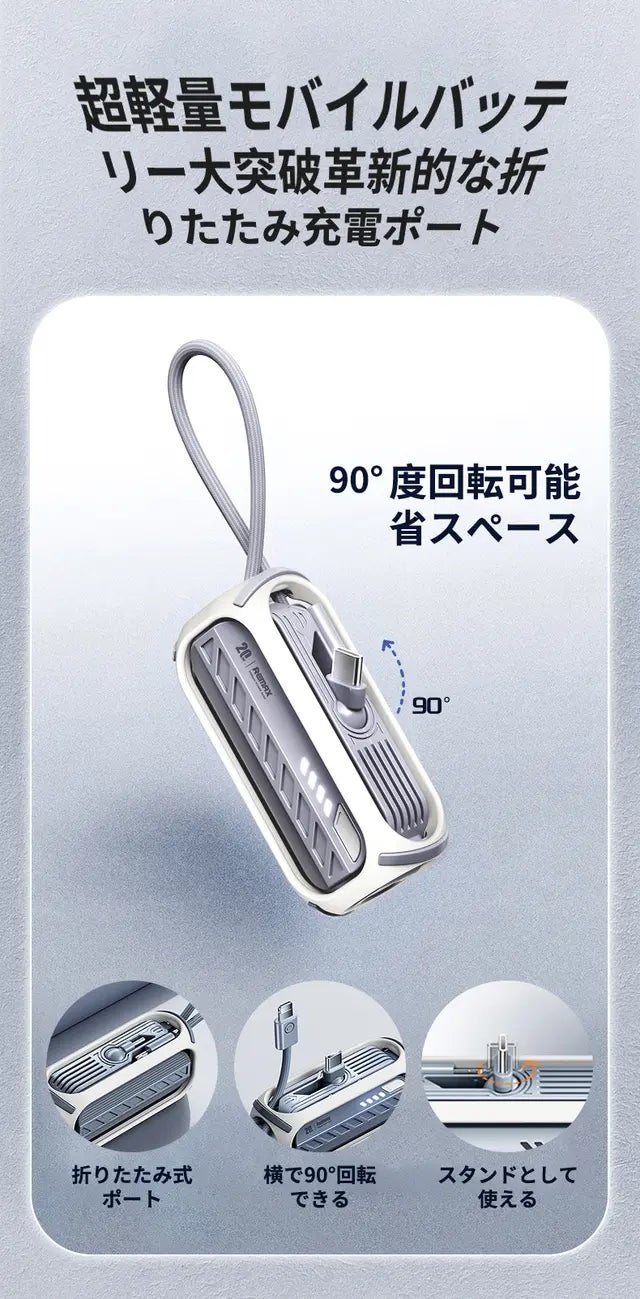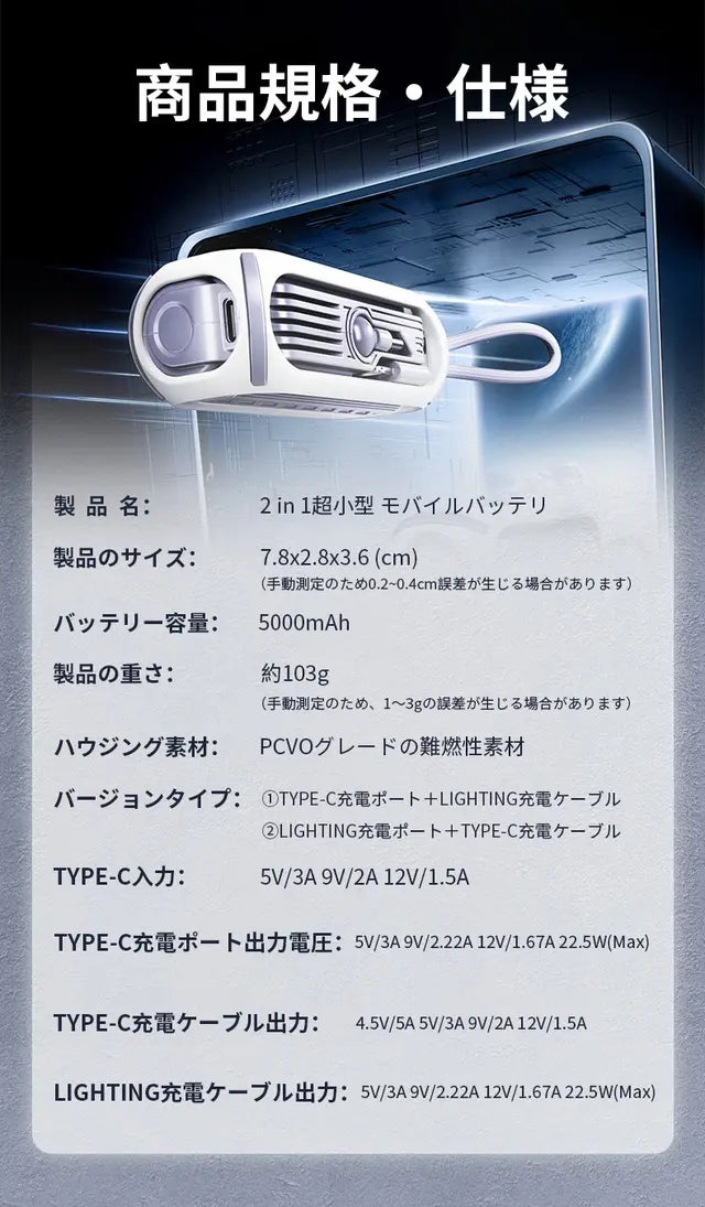 超小型&軽量、Lightning/Type-c充電コネクターとケーブル内蔵型だからスマホに直接差し込んで、充電することができます!他のケーブル無しなので、充電しながらスマホ使用も!モバイルバッテリーが邪魔にならず、すごく使いやすい!