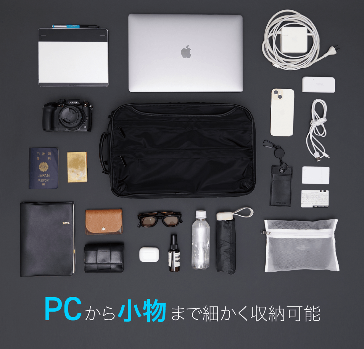 クールでコンパクトな見た目からは想像できない収納力。外回りに行く際の細々とした持ち物もきっちり整理・収納できます。