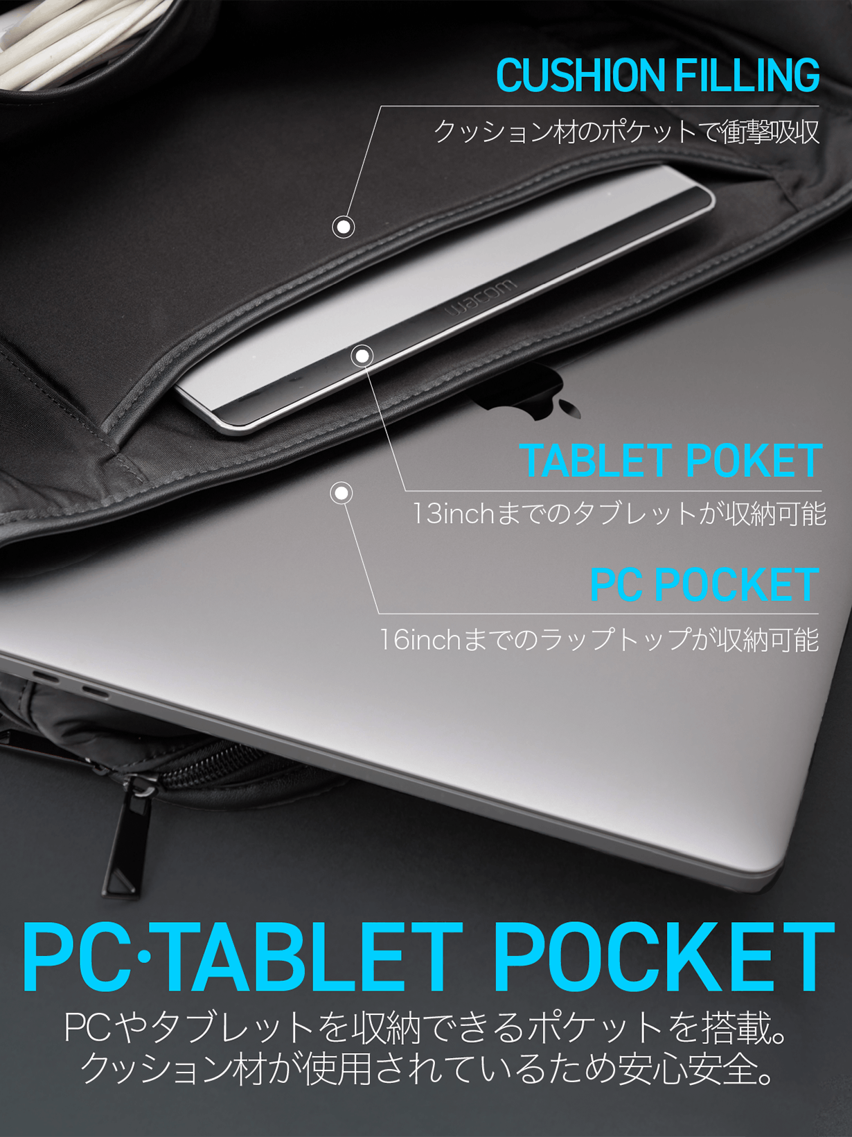 クッション材の入ったPC、タブレット用ポケットも搭載しております。幅は16インチのPCでも楽々収納可能。
