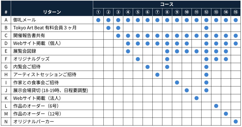 この度、作家や会場にもご協力をいただき、たくさんの返礼品を用意いたしました。支援コースとのマッピングと、各リターンの概要をご確認ください。