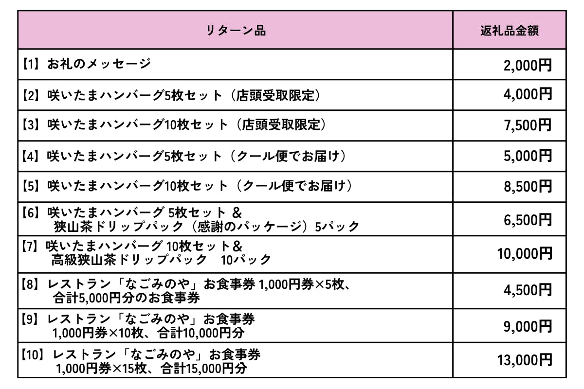 • \今、一番人気のリターン品はこちら!/たくさんのご支援をありがとうございます!現在、大注目のリターン品は…!1位!咲いたまハンバーグ5枚セット(店頭受取限定) 4,000円 埼玉の恵みがギュッと詰まった「咲いたまハンバーグ」を、お得にお試しいただける5枚セット!!2位!咲いたまハンバーグ10枚セット+高級狭山茶ドリップパック10パック+お礼の手紙 10,000円 ハンバーグの美味しさに加え、埼玉が誇る高級狭山茶も楽しめる贅沢セット!どちらも「咲いたまハンバーグ」の旨味を存分に堪能できるラインナップです。募集期間:2024年12月23日(月)~2025年1月30日(木)あなたのご支援が、埼玉県の魅力を全国へ広げる一歩となります!ぜひこの機会に、「咲いたまハンバーグ」の美味しさを体験してください。※リターン品のお渡し・配送は2025年2月以降となりますので、ご了承ください。埼玉の美味しさを、皆さんの食卓へお届けします! もっと見る