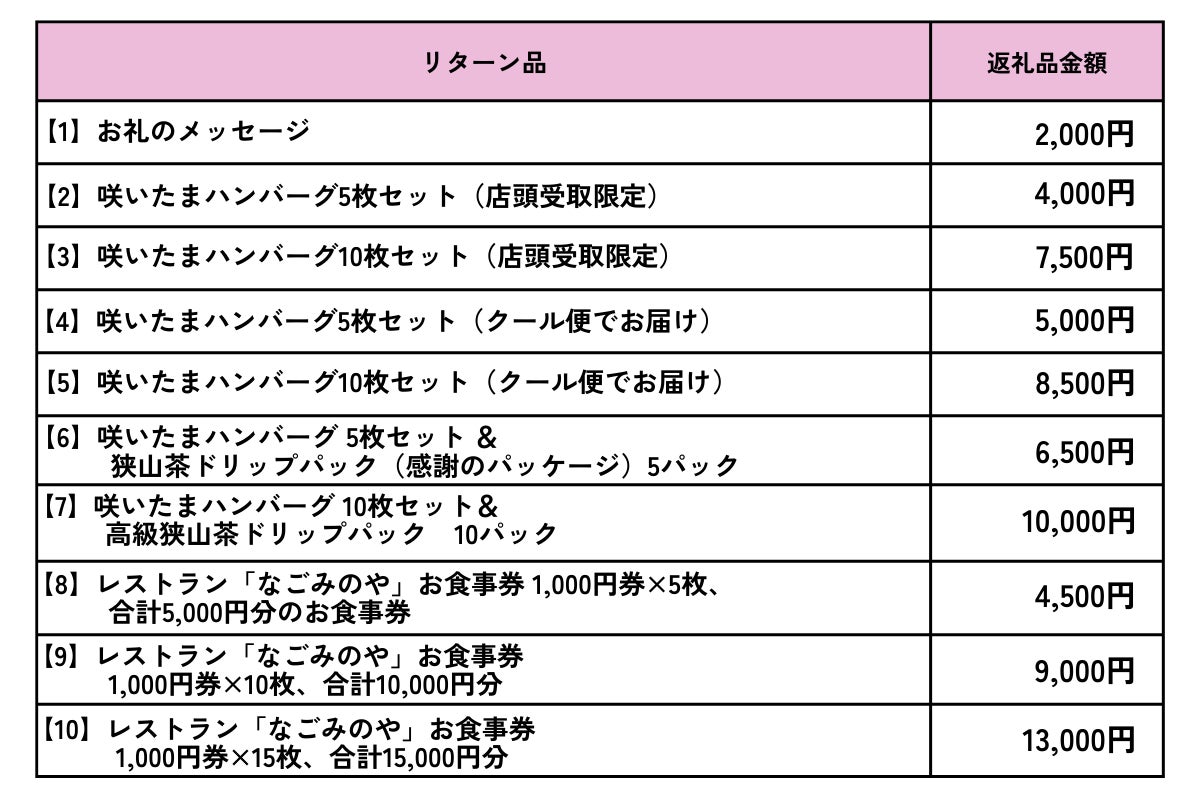 2025/01/06 12:24\今、一番人気のリターン品はこちら!/たくさんのご支援をありがとうございます!現在、大注目のリターン品は…!1位!咲いたまハンバーグ5枚セット(店頭受取限定) 4,000円 埼玉の恵みがギュッと詰まった「咲いたまハンバーグ」を、お得にお試しいただける5枚セット!!2位!咲いたまハンバーグ10枚セット+高級狭山茶ドリップパック10パック+お礼の手紙 10,000円 ハンバーグの美味しさに加え、埼玉が誇る高級狭山茶も楽しめる贅沢セット!どちらも「咲いたまハンバーグ」の旨味を存分に堪能できるラインナップです。募集期間:2024年12月23日(月)~2025年1月30日(木)あなたのご支援が、埼玉県の魅力を全国へ広げる一歩となります!ぜひこの機会に、「咲いたまハンバーグ」の美味しさを体験してください。※リターン品のお渡し・配送は2025年2月以降となりますので、ご了承ください。埼玉の美味しさを、皆さんの食卓へお届けします! もっと見る