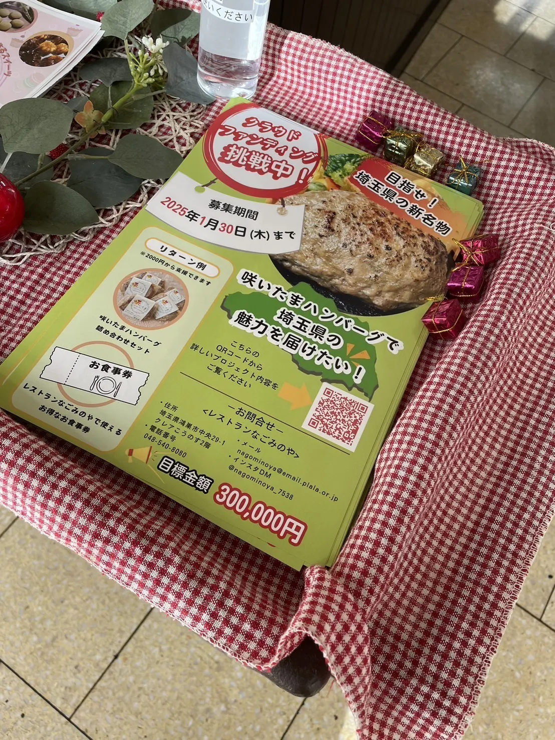 2025/01/08 21:14店頭にはチラシを設置しています!多くの方にご覧いただき、お手に取っていただけると嬉しいです!「咲いたまハンバーグ」の美味しさと、埼玉県の魅力をもっと多くの方に知っていただくために、 皆さまの応援がとても大きな力になります! 募集期間:2024年12月23日(月)~2025年1月30日(木) もっと見る