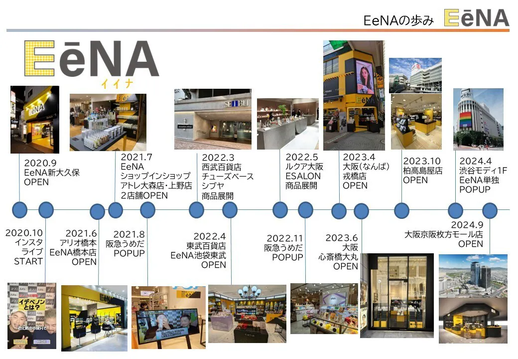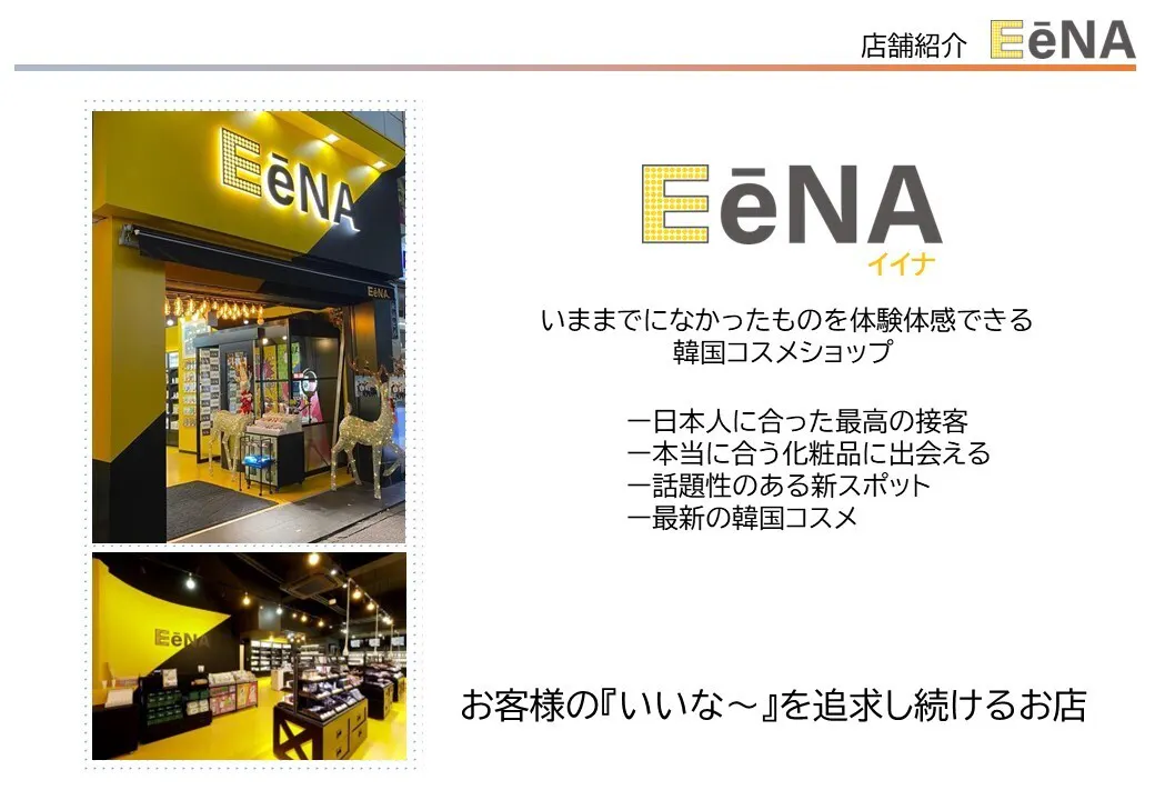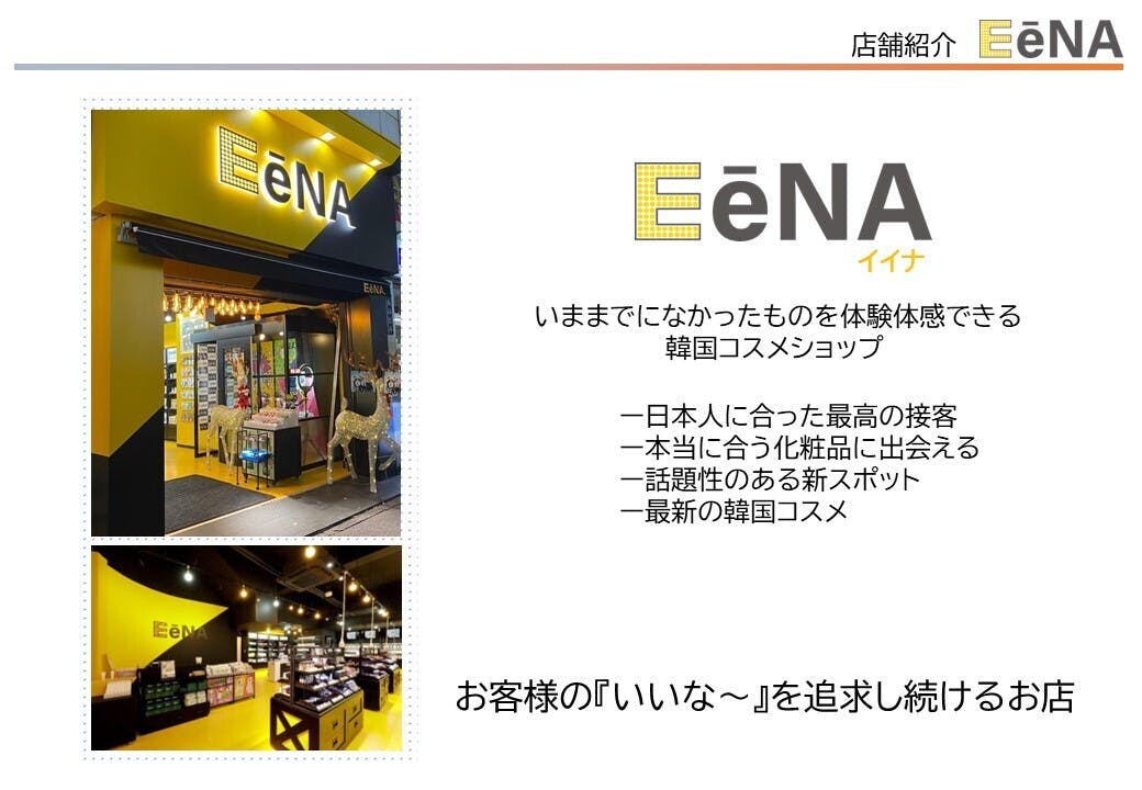 EeNAでは勢力的に店舗展開(期間限定含む)を行い、本店として新大久保店、柏高島屋、枚方モール、チューズベースシブヤ(渋谷西武別館)にて現在も展開中。期間限定として、池袋東武百貨店(2年)、アリオ橋本(1年)、心斎橋大丸(1年)、梅田阪急百貨店(POPUP2回)、モディ渋谷(POPUP)を行い、店舗展開のナレッジを蓄積。