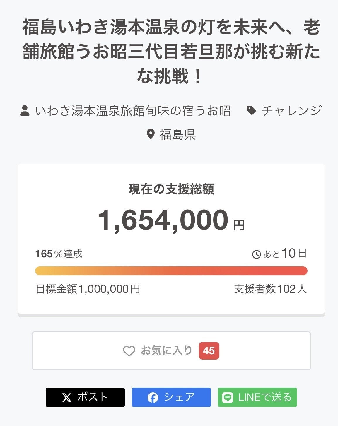 2025/03/21 22:45さてクラウドファンディングもいよいよ大詰めを迎えて来ました!気づけば残り10日。。思い起こせば初めての挑戦だった事もあって、半信半疑の中でプロジェクトをスタートしたっけなと。。しかしながらおかげさまで目標金額を大きく上回るご支援を賜ることができ改めて本当に感謝に堪えません。ありがとうございました。リニューアルが楽しみです。((´∀`*))より魅力のある愛されるお宿として、皆様にお越しいただけるように気を引き締めて邁進していきたいと思います。最後の最後まで駆け抜けます! もっと見る