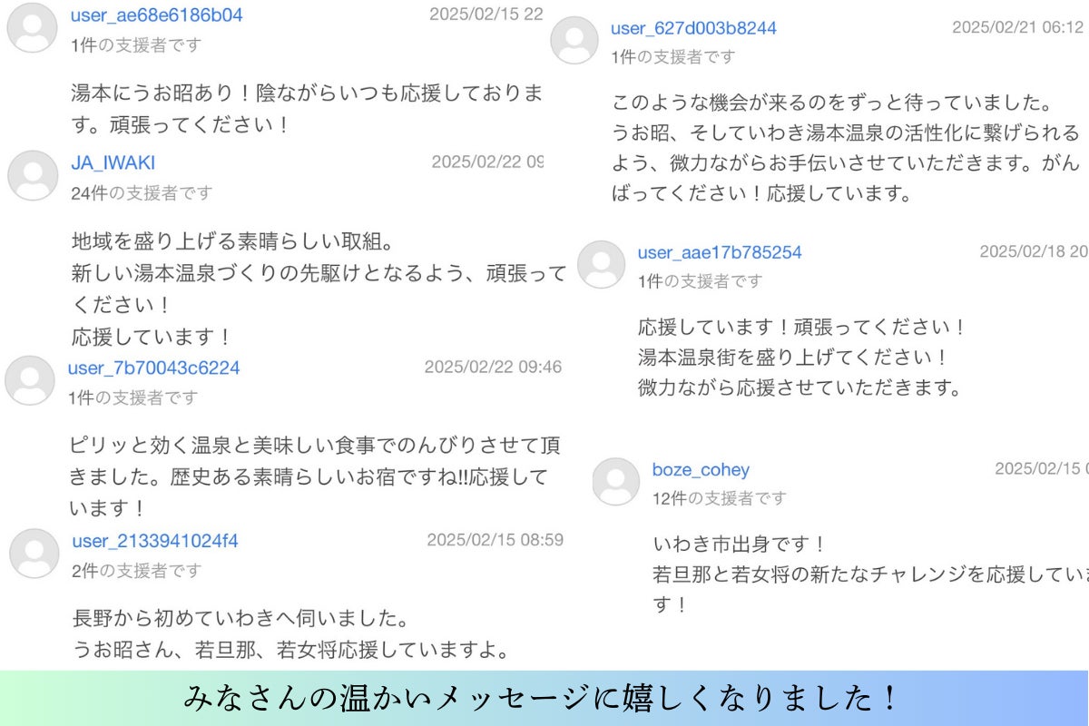 2025/03/21 22:45さてクラウドファンディングもいよいよ大詰めを迎えて来ました!気づけば残り10日。。思い起こせば初めての挑戦だった事もあって、半信半疑の中でプロジェクトをスタートしたっけなと。。しかしながらおかげさまで目標金額を大きく上回るご支援を賜ることができ改めて本当に感謝に堪えません。ありがとうございました。リニューアルが楽しみです。((´∀`*))より魅力のある愛されるお宿として、皆様にお越しいただけるように気を引き締めて邁進していきたいと思います。最後の最後まで駆け抜けます! もっと見る