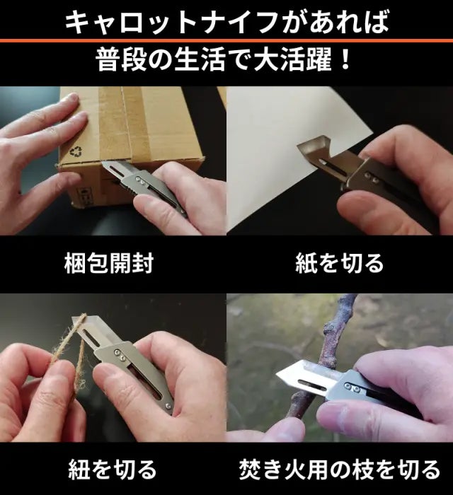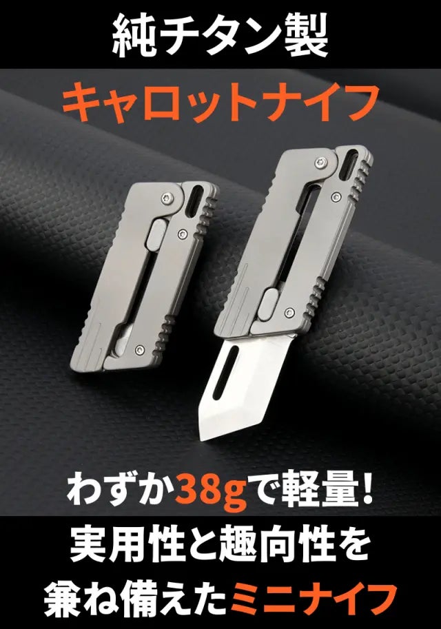 この純チタン製キャロットナイフは、大人の心を魅了するだけでなく、実用性も抜群です。日常のちょっとした作業やアウトドアシーンでも活躍します。