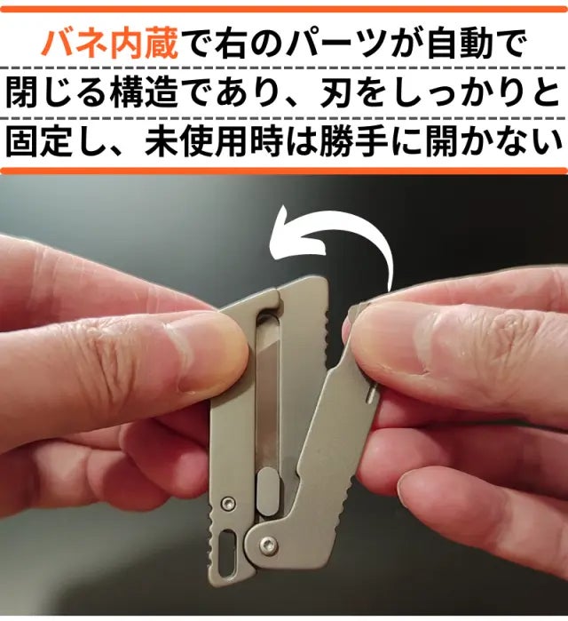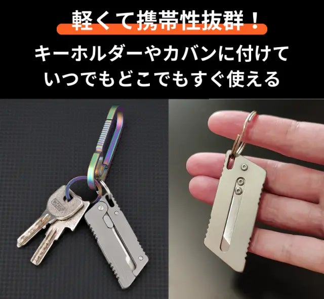 また、バネ内蔵で開閉をアシストし、未使用時には刃が勝手に出ることがない安全設計も取り入れました。さらに、キーホルダーに付けて持ち運びが便利で、いつでもどこでも使用可能です。