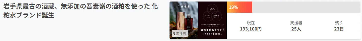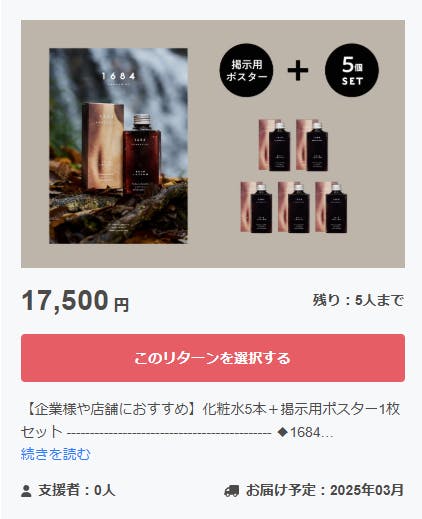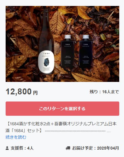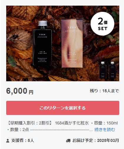 限定数の提供となります【2割引】での化粧水のリターン品は、既に1本のパッケージは完売。