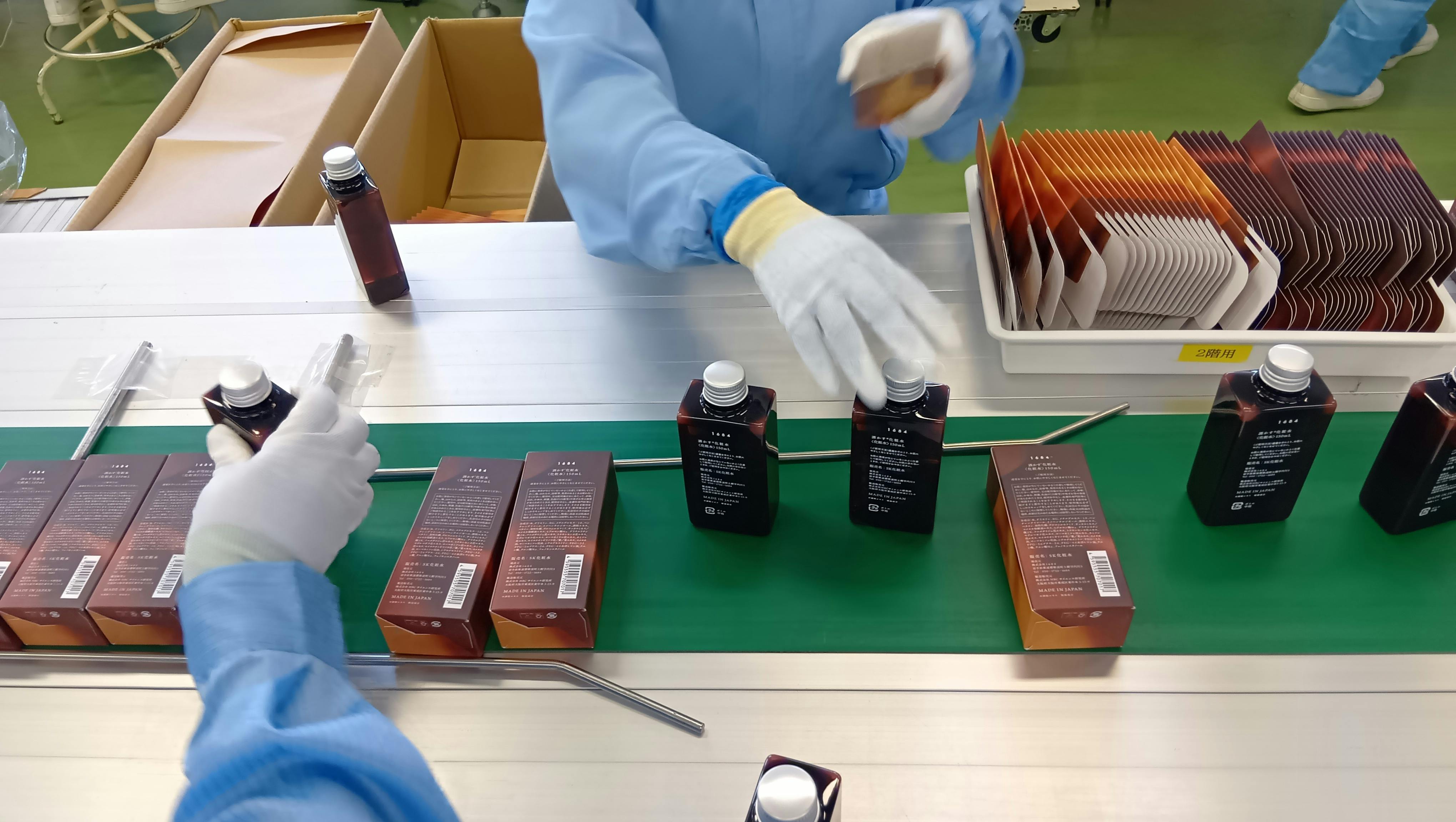 化粧水をボトルに充填した後は、箱詰めをしてくださっています。箱詰めや検品の作業は、なんと手作業…!