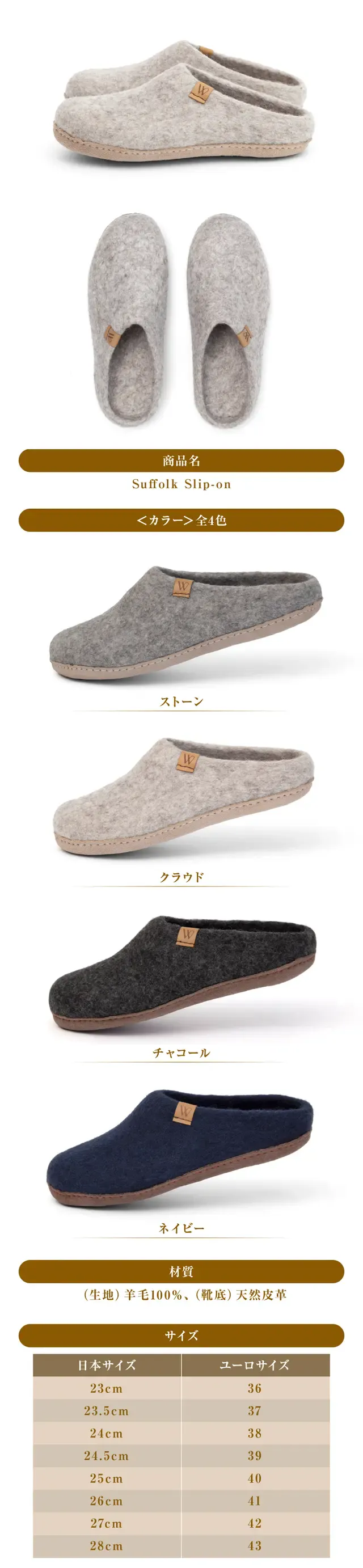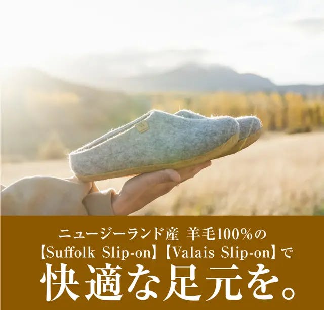 【Suffolk Slip-on】【Valais Slip-on】は世界有数の「羊の国」ニュージーランド産の羊毛を100%使用した究極のルームシューズです。