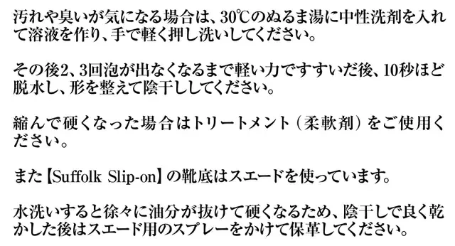 Suffolk:ソールがスエードで作られているため、外履きでのご使用は推奨しておりません。屋内での使用をおすすめいたします。
