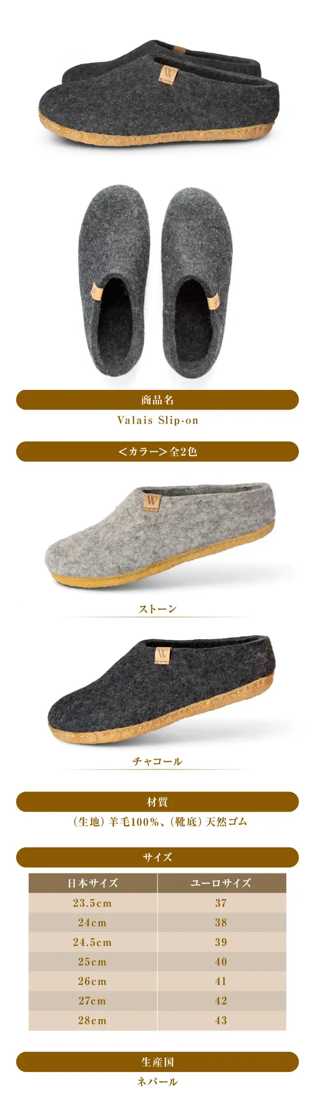 ルームシューズまたは軽い外履きとしてアッパー部分のフェルトを厚く靴底をラバーソールにした【Valais Slip-on】の2タイプをご用意しました。