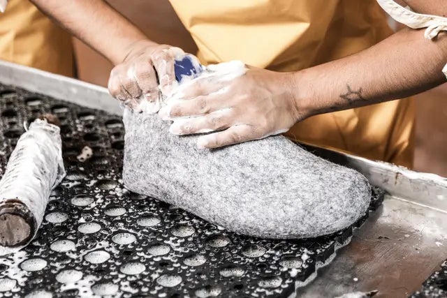 しかし、縫い目の無いルームシューズにフェルトを仕立てるには機械ではできず、1足分のフェルトを作るには大変な根気と労力が必要です。