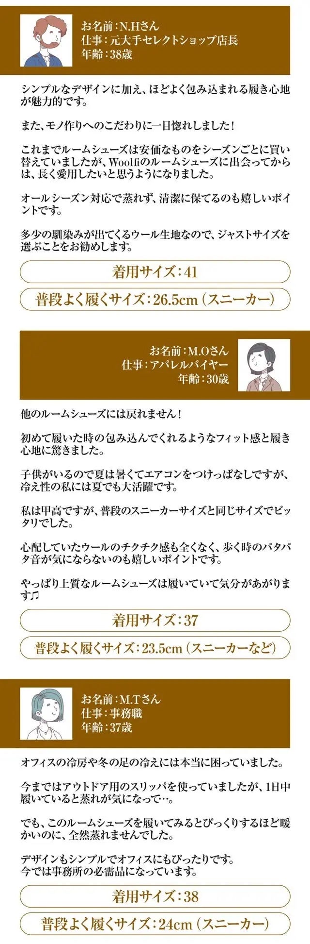 WoolfiのSuffolkと出会い、使用することでルームシューズの概念がガラリとかわりました。私は、もともとルームシューズに拘りがあるタイプではありませんでした。むしろ素足でも全然構わない、無頓着なタイプ。優しく包み込まれるフィット感、さらりとした肌感、蒸れのない通気性の良さ。素足でいることよりも、履いていたくなる。素材や作りの違いで、こんなにも違いがあるのかと実感しました。Woolfiの製品に惚れ込み、オーナーとの話し合いを通じて、彼らの物作りに対する拘りや信念の強さに感動し、日本にもこの商品の良さを広めたいと思いました。