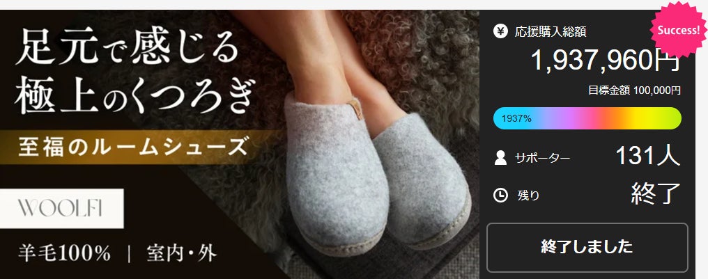 ※リターン品の配送が完了するまで、有限会社たかやまはWoolfiの日本における独占販売権を有する製機代理店です。