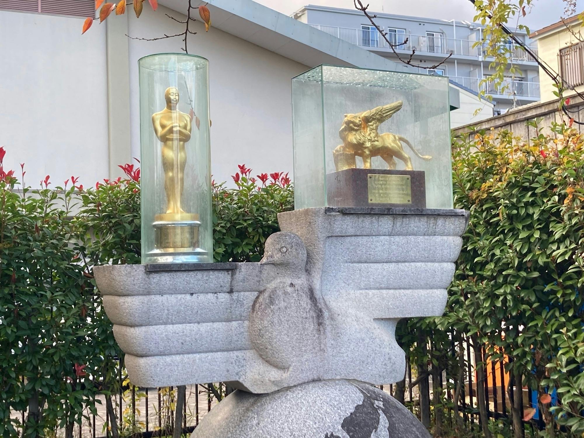 太秦中学校の表、大映京都撮影所の正門があった跡地に『羅生門』のトロフィーやオスカー像のレプリカが展示されています。