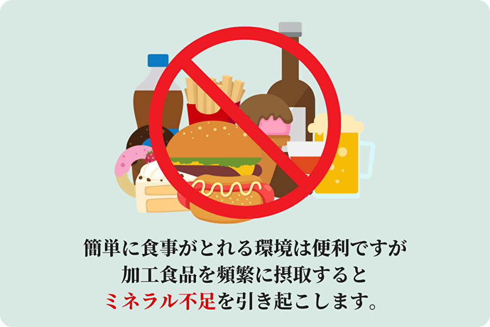 外食やコンビニなどで簡単に食事がとれる環境は便利ですが、精白米や小麦、砂糖などの精製された食品、ハムやソーセージ、インスタント麺などの加工食品を頻繁に摂取する事は、ミネラル不足につながります。