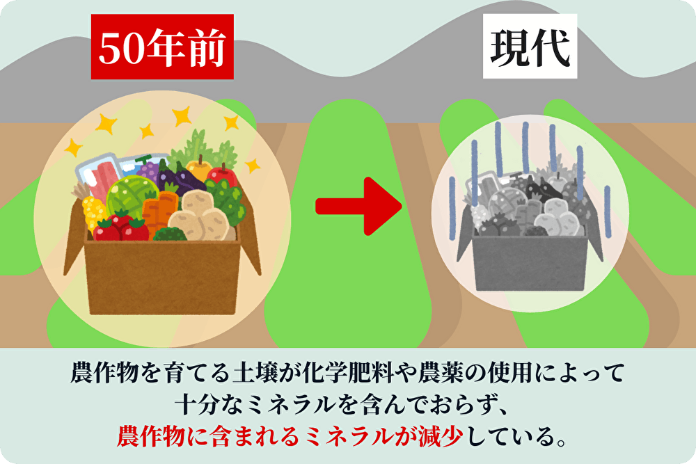農業の近代化によって農作物を育てる土壌が化学肥料や農薬の使用によって十分なミネラルを含んでおらず、農作物自体に含まれるミネラルが減少していると言われています。