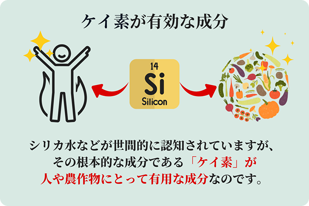 シリカ水などが世間的に認知され広まっていますが、その根本的な成分である「ケイ素」が人や農作物にとって有用な成分なのです。