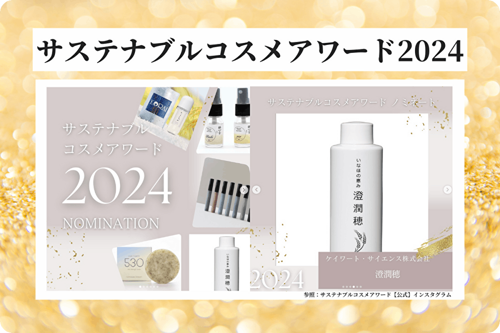 化粧水としての力も素晴らしく、弊社が開発したもみ殻由来の化粧水『澄潤穂-ちょうじゅんすい-』が、人にも地球にも優しいコスメを応援する「サステナブルコスメアワード2024」にノミネートされた実績も持っております。