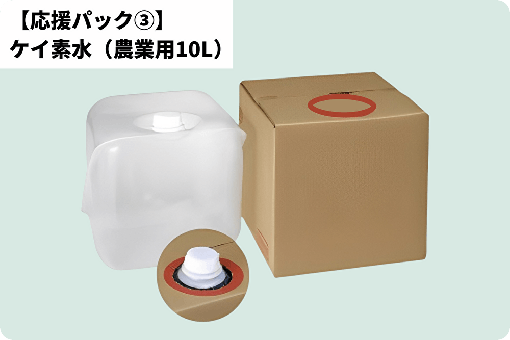 応援パック③には、お礼のメッセージと農業用の10Lケイ素水が含まれています。