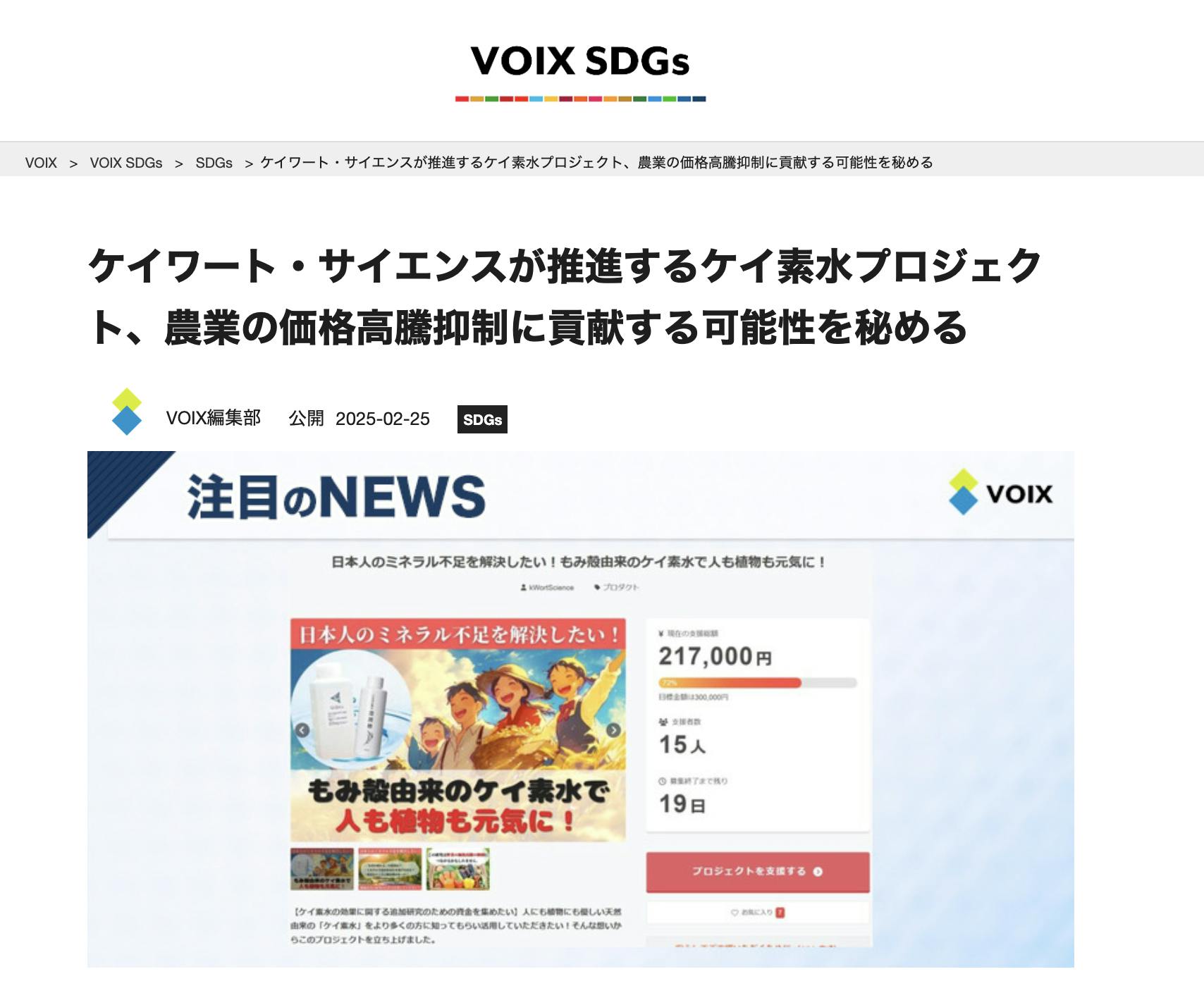 2025/02/28 22:51ご覧いただきありがとうございます!ニュースメディアのVOIX (ボイス)のSDGsページにて弊社ケイ素水のクラウドファンディングが取り上げられました!多くの皆様にケイ素水の認知が広がっていく事は大変喜ばしいです!下記のリンクよりぜひご覧ください。↓ページリンクはこちら!https://voix.jp/sdgs/sdgs/56529/ もっと見る