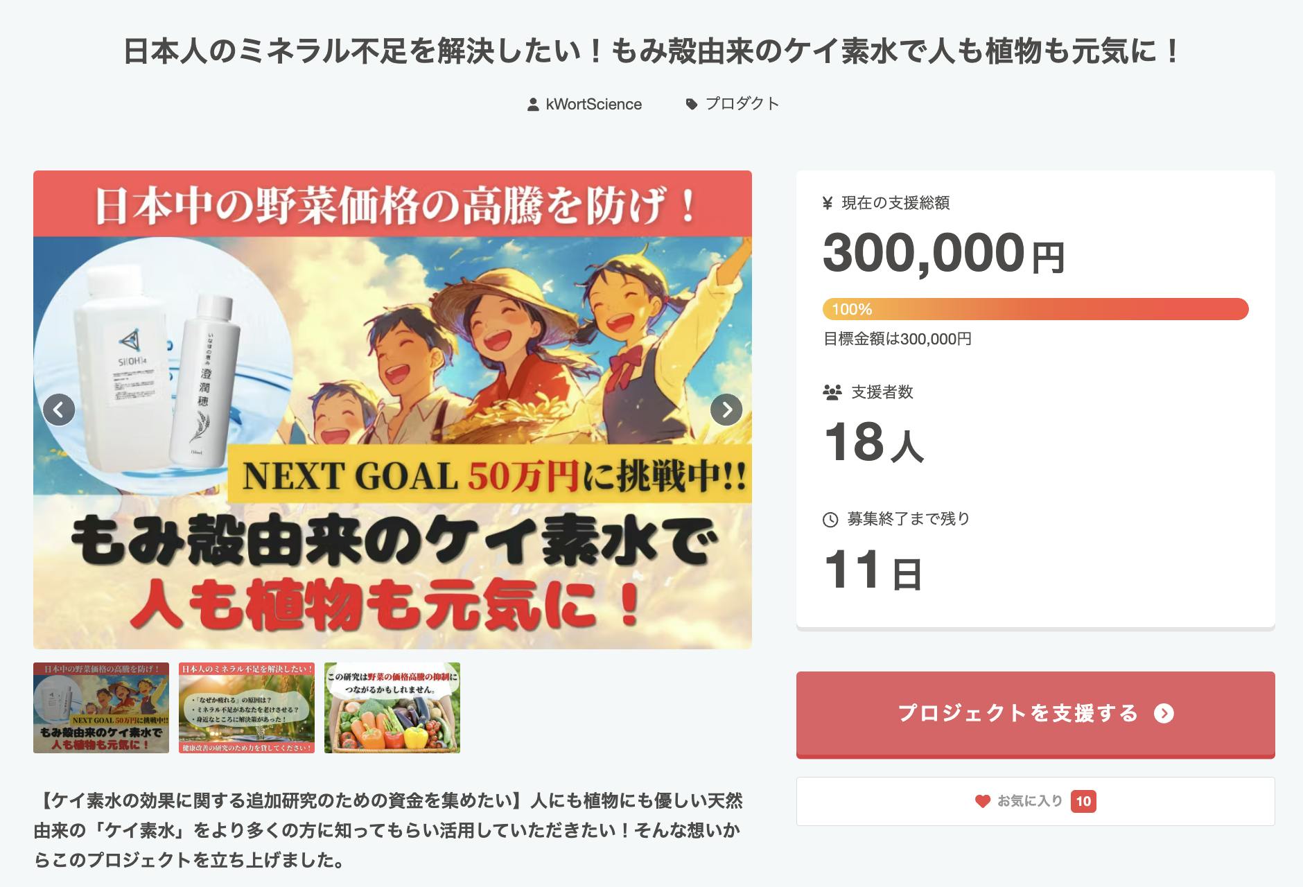 2025/03/05 10:40多くの方のご支援をいただき、当初予定していた目標金額を達成することができました。ご支援くださった皆様、プロジェクトに興味を持ってくださった皆様、本当にありがとうございます。残りの公開期間はケイ素水の素晴らしさを、まだまだ多くの方に知っていただくためにネクストゴールを設定し、挑戦を続けます!更なる認知拡大へのご支援、ご協力何卒よろしくお願いいたします! もっと見る