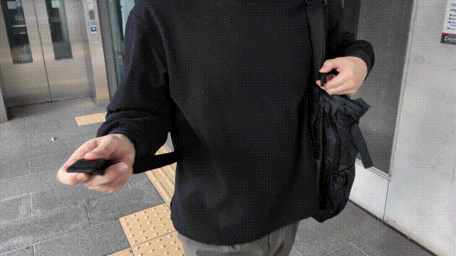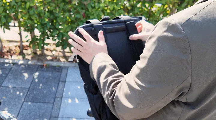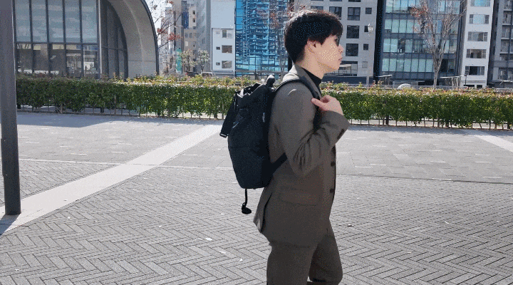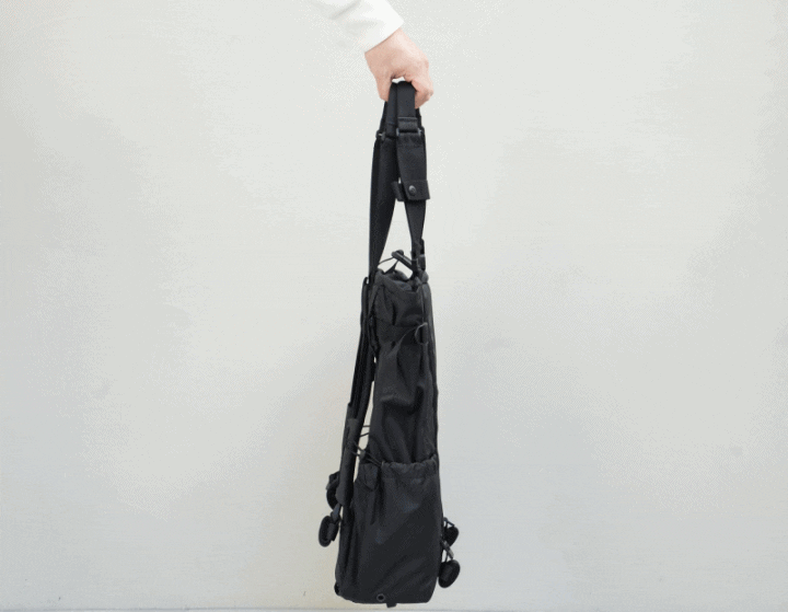バッグの重さでリュック用のショルダーストラップがピタッとバッグに貼り付き、一般的な2WAYバッグに比べ遥かにシームレスで行動できます。