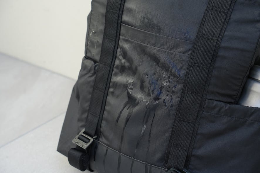 表面は耐摩耗性や強度に優れた210デニールのナイロン生地で、引き裂きによる破れの拡大を防ぐ格子状のステッチを加えています。