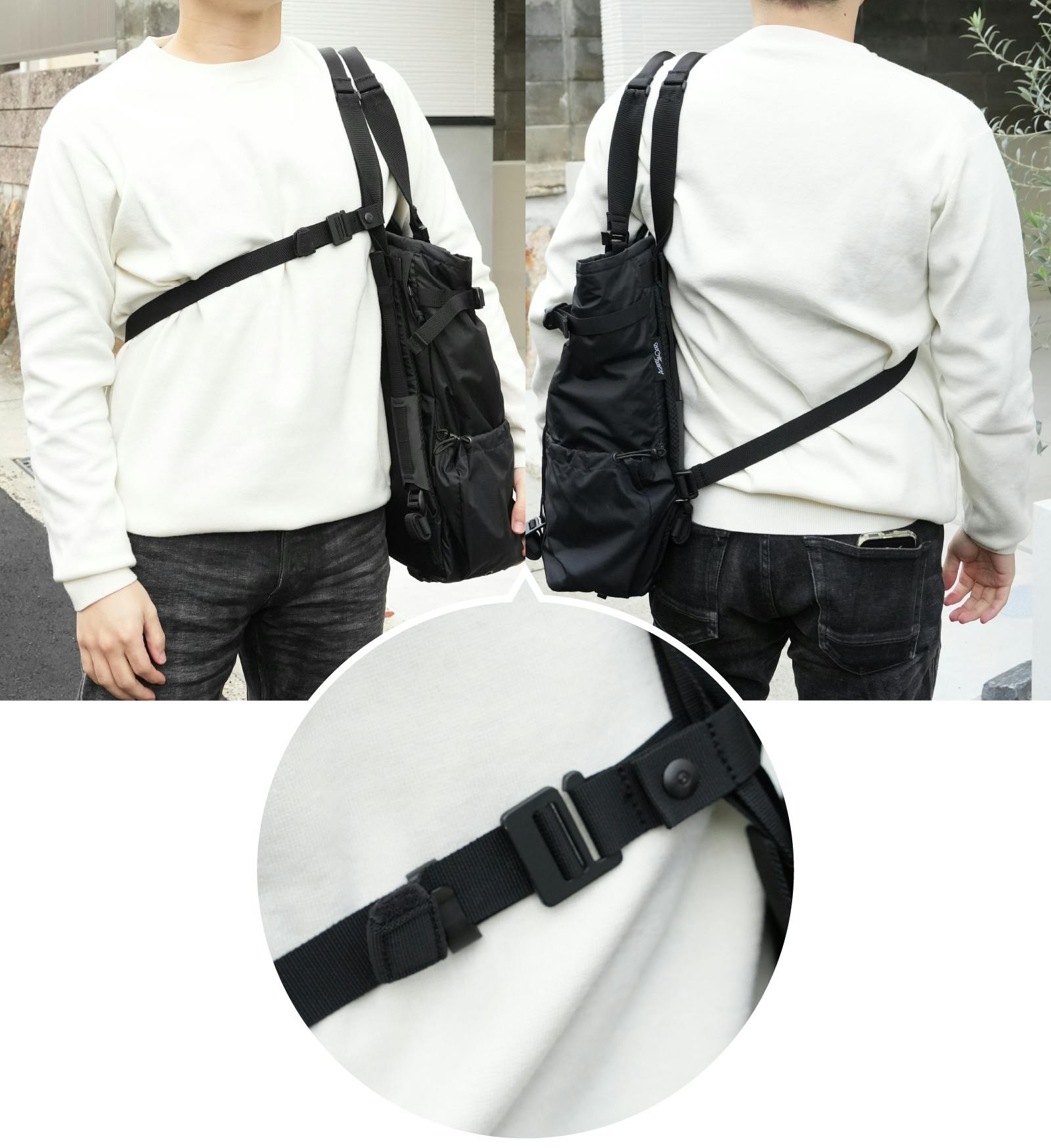 またトートバッグで使う時も、体に密着できる鉤型(かぎなり)のバックルストラップを別パーツで付属しています。
