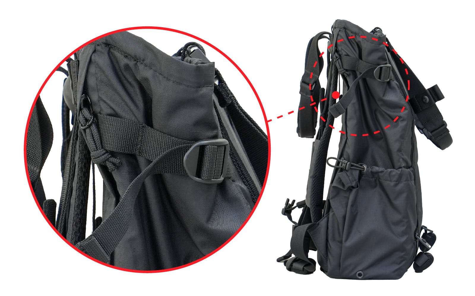 またリュックの際、荷物の収納後にサイドベルトでメインコンパートメントの隙間を収縮すると、運搬中に中の荷物が揺れ動くのを抑制できます。