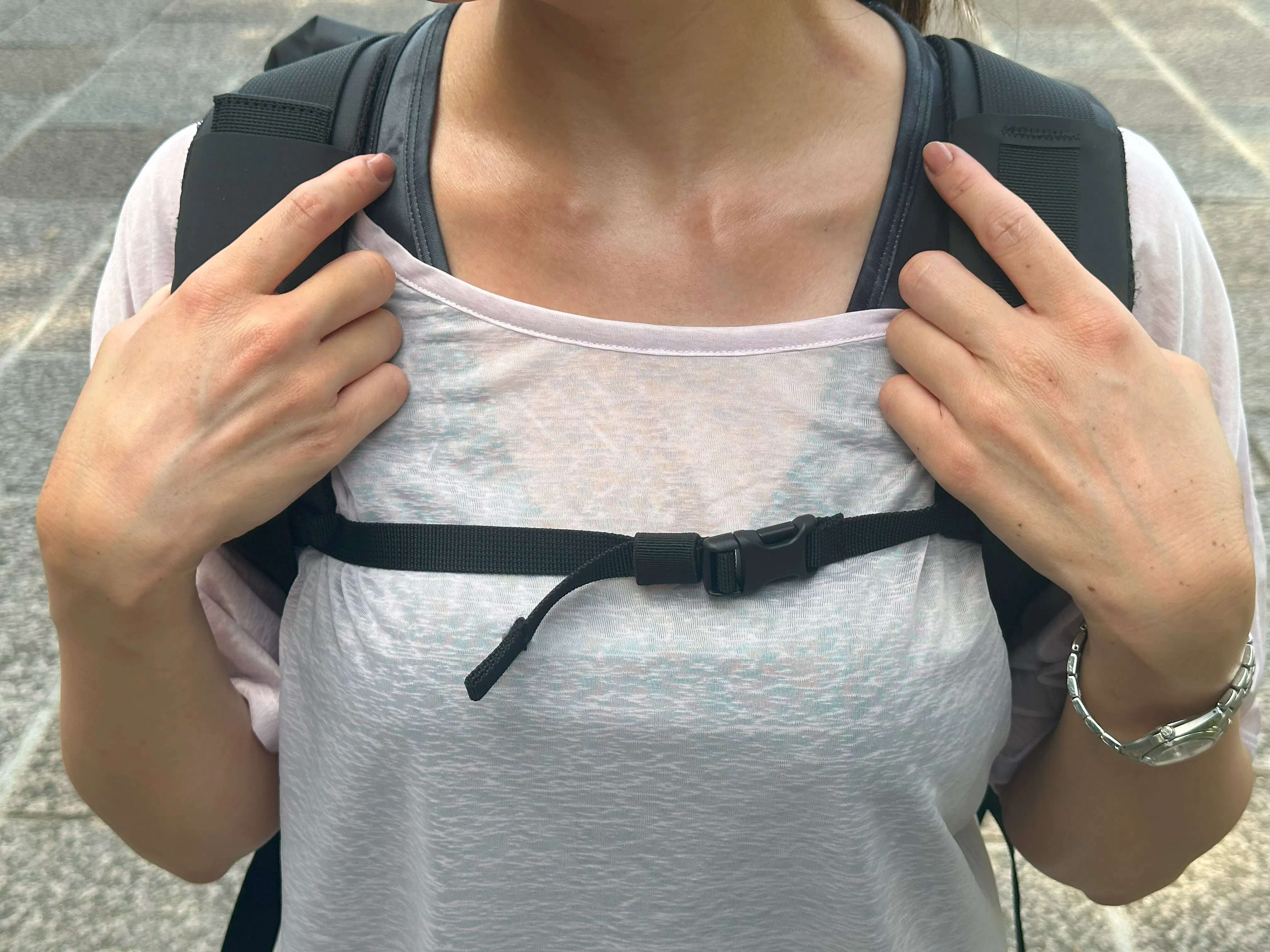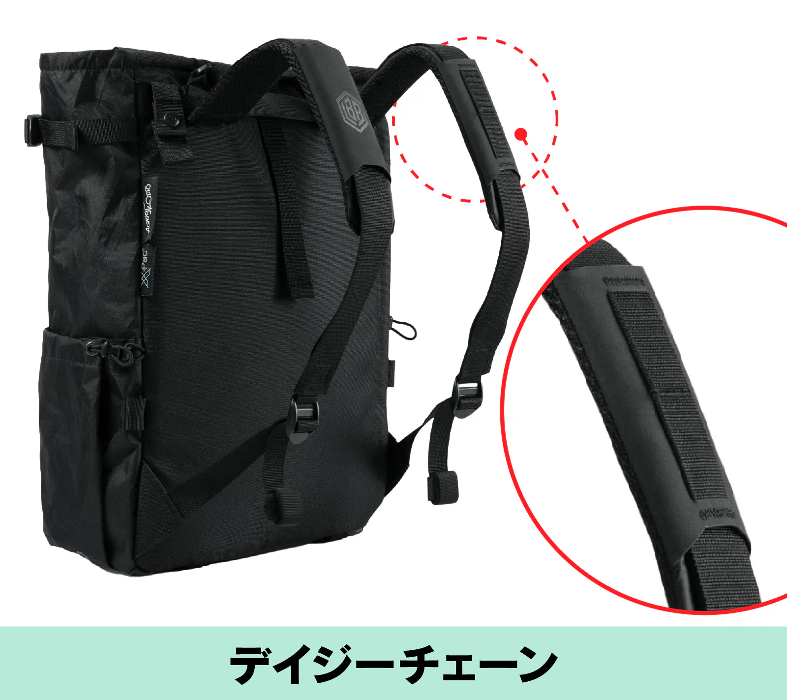 またリュックの左ショルダーストラップにもデイジーチェーンを設け、カラビナ付きのポーチやライトなどを接続可能。