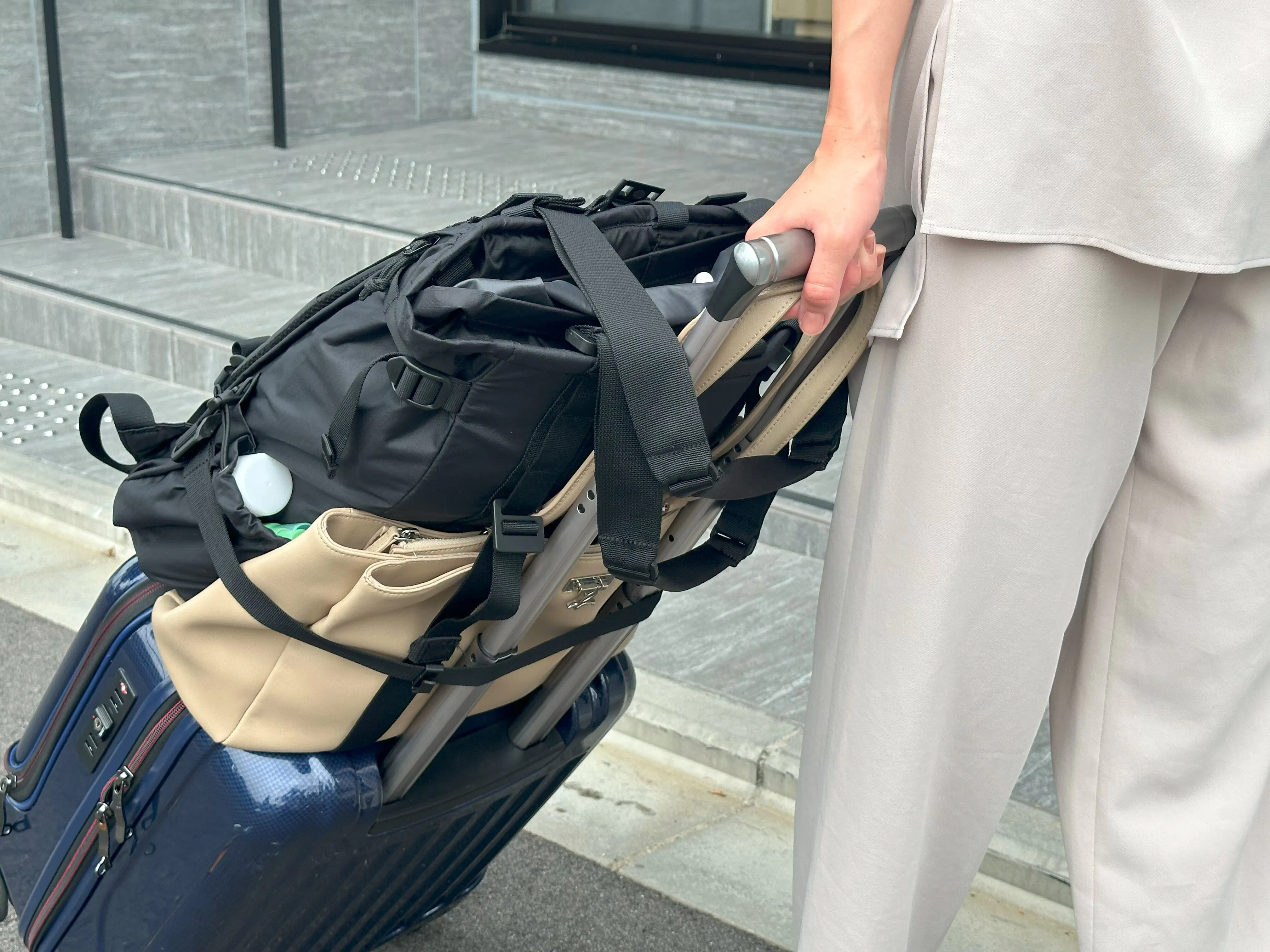 A. 付属のストラップを使用すると大きめの荷物をバッグの外側に固定して運ぶことができます。