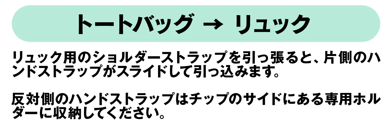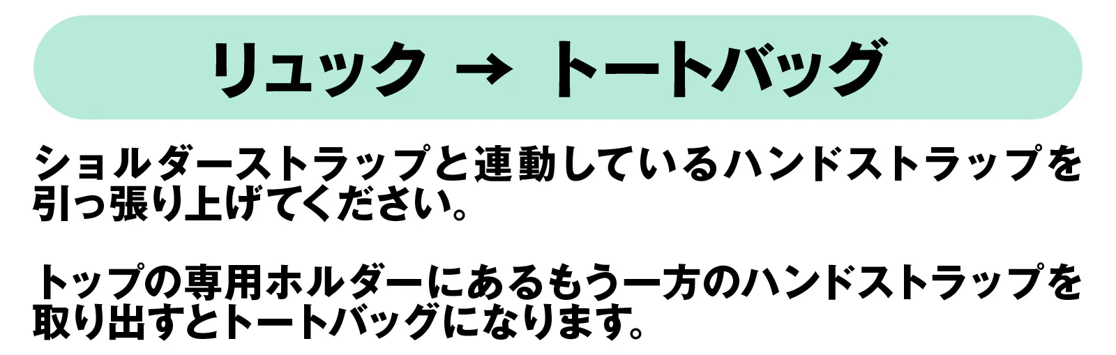 A. リュックとして使う場合は、左右のショルダーストラップを引っ張るだけ。リュックからトートバッグに変える時もトップに引っ込んでいるハンドルを引っ張り出すだけなので瞬時に切り替えられます。
