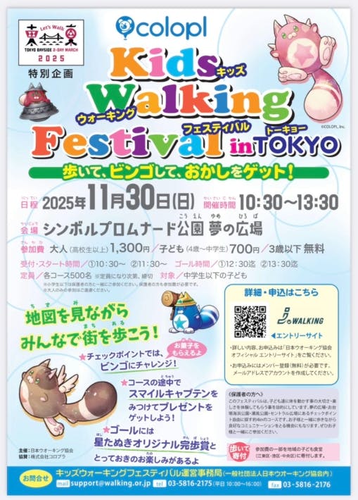 「キッズウォーキングフェスティバル in tokyo」4キロ開催時間 10:30~13:30参加費 大人1700円・子供700円(お子様のみでの参加はできません)※中学生以下対象事前予約 https://jwalking.jp/zenkoku/kids-walking-festival-in-tokyo1130/ 締め切り11月3日定員が500名のため、枠が埋まり次第締め切り。 当日申し込みも枠が空いてたらできますが、確実に参加されたい方は事前予約をしてください。