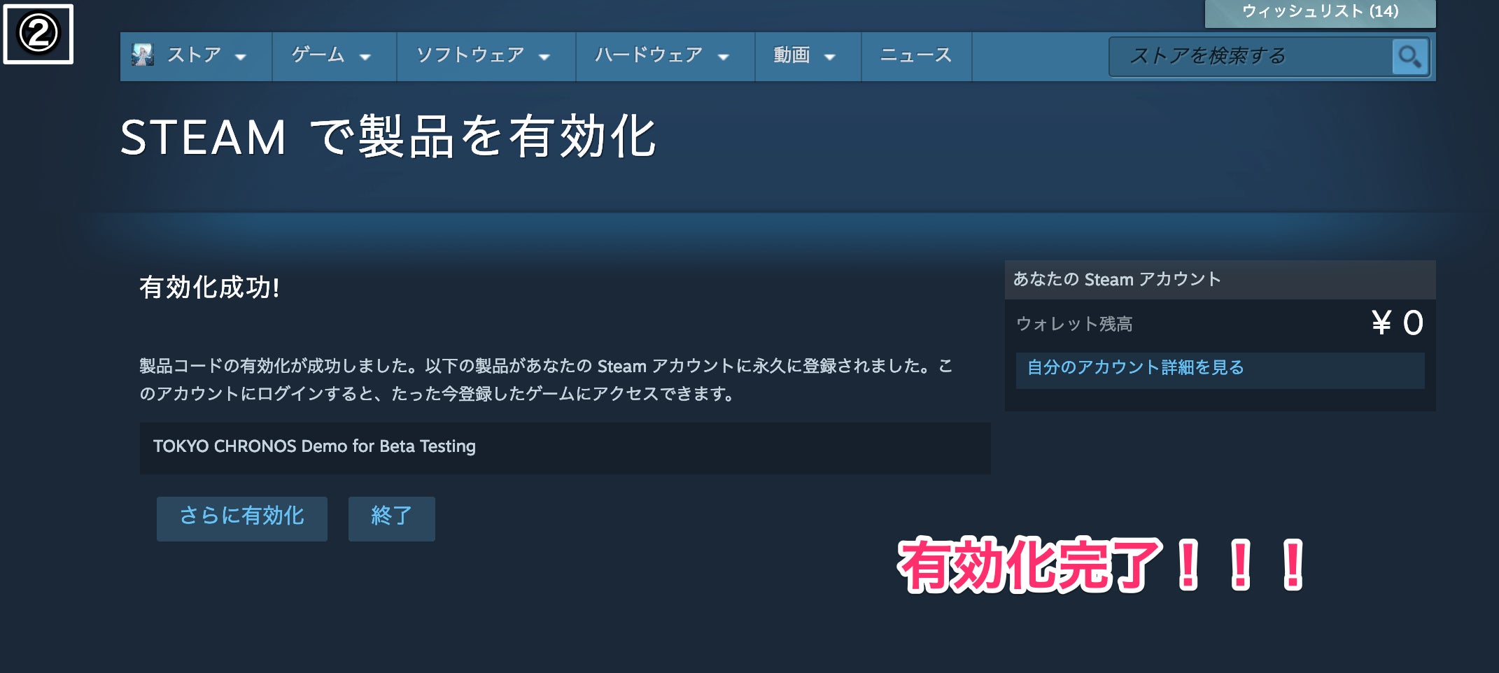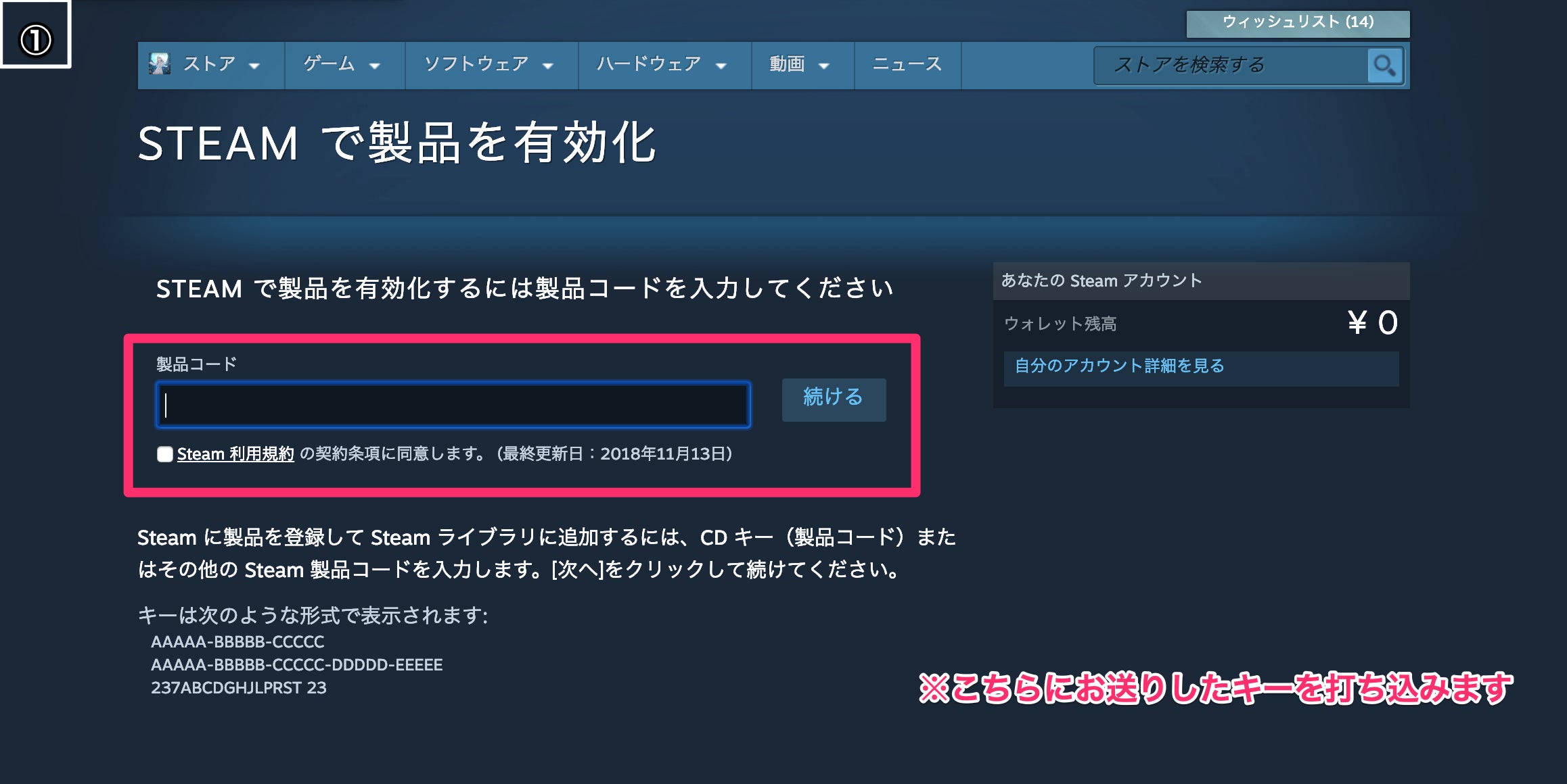 ①メールに記載されたDLキーを、Steamブラウザにてキーコードを打ち込む
