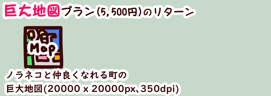 巨大地図プラン(5,500円)【オススメ!】は「『ノラネコと仲良くなれる町』の全体マップ」をお届けいたします。A3より大きい特殊サイズ(20000 x 20000px、350dpi)になります。本プランには「絵本」本編は含まれません。