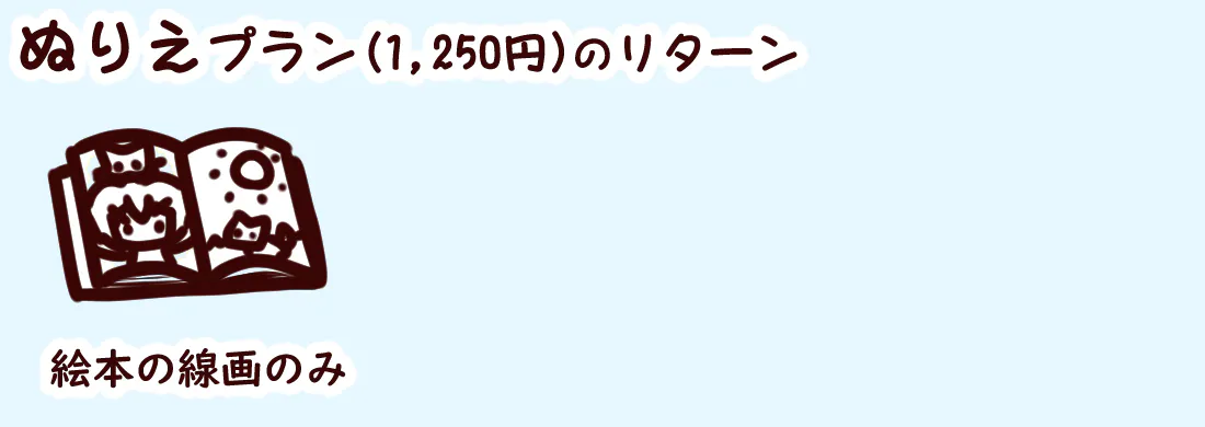 ぬりえプラン(1,250円)は「絵本」の線画をjpegまたはpngでお届けいたします。ぬりえとしてお楽しみください。本プランには「絵本」本編は含まれません。