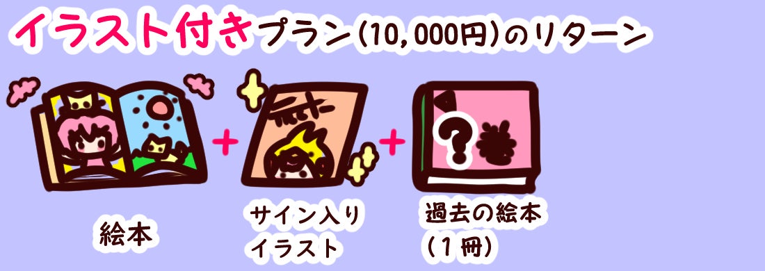 イラスト付きプラン(10,000円)は「絵本」「サイン入りイラスト」「過去の絵本(低解像度版)(1冊)※1」を電子書籍またはjpegでお届けいたします。